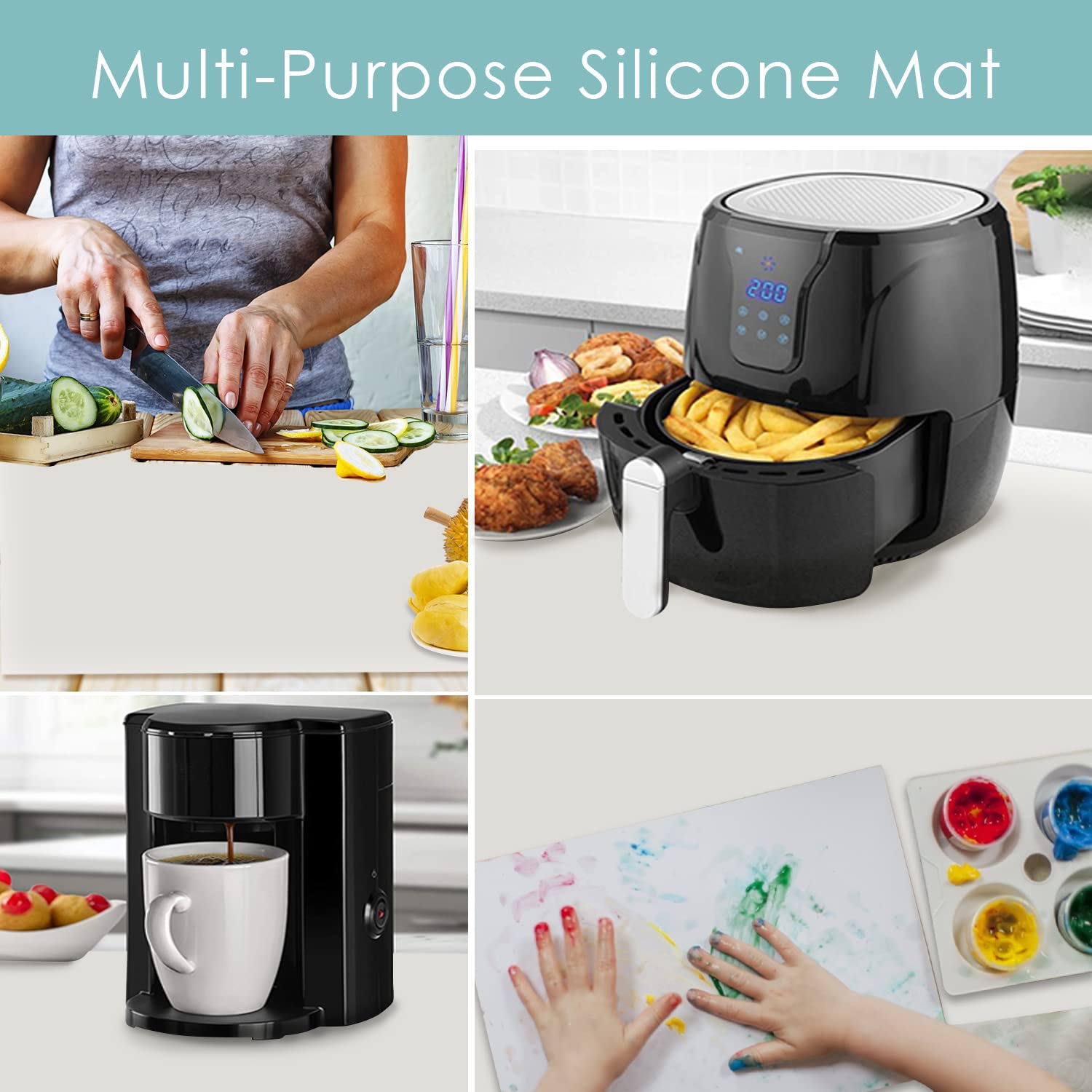 - 🍲 【Silicone Countertop Protector Mat】: The safe temperature is between -40°F and 446°F (≤230°C), our silicone heat resistant mat protects the countertop from heat damage, scratches, stains. Place it under the air fryer, microwave, oven, the nonslip silicone table mat keeps extending the life of tables, enjoy your cooking more relaxedly.
