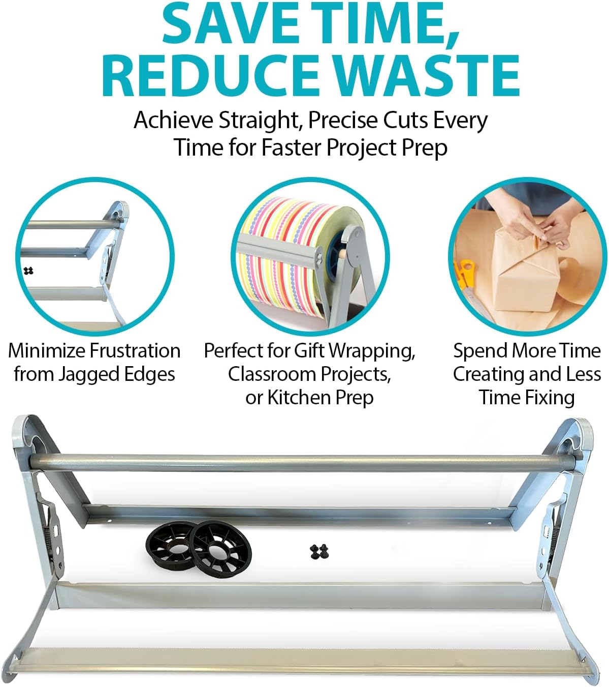 - KEEP PAPER NEAT, ACCESSIBLE & READY TO USE – No more messy rolls or wasted paper with our multi-purpose paper roll cutter. This paper roll dispenser and cutter keeps your paper organized, easy to grab, and always ready when you need it. This kraft paper roll dispenser is a smart, time-saving solution for busy kitchens, classrooms, or workspaces.