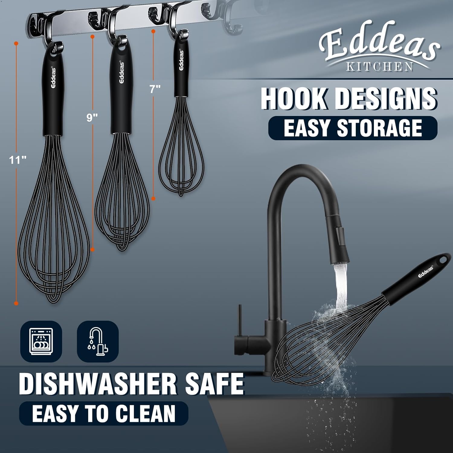 - FOOD GRADE SILICONE - Eddeas Silicone Whisk are made with food grade silicone wrapped with high quality steel wire, which solves the problem of friction between kitchenware and damage to the non-stick coating, Whisks for cooking protects your non-stick cookware, plus the built-in The steel wire, which provides strong support when stirring, wisking tools is the first choice in the kitchen.