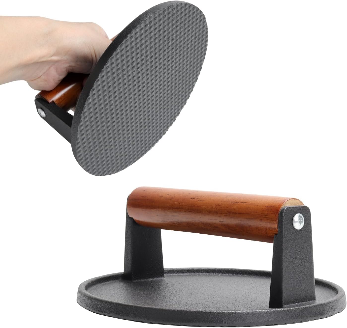 - Heavy and sturdy cast iron smash burger press: Made of thicker and heavier cast iron, our hamburger bacon press effortlessly crushes burgers, flattens bacon, and allows food to heat evenly, saving cooking time. The handle is made of heat-resistant natural solid wood for sturdiness and durability, allowing you to grill comfortably and safely.