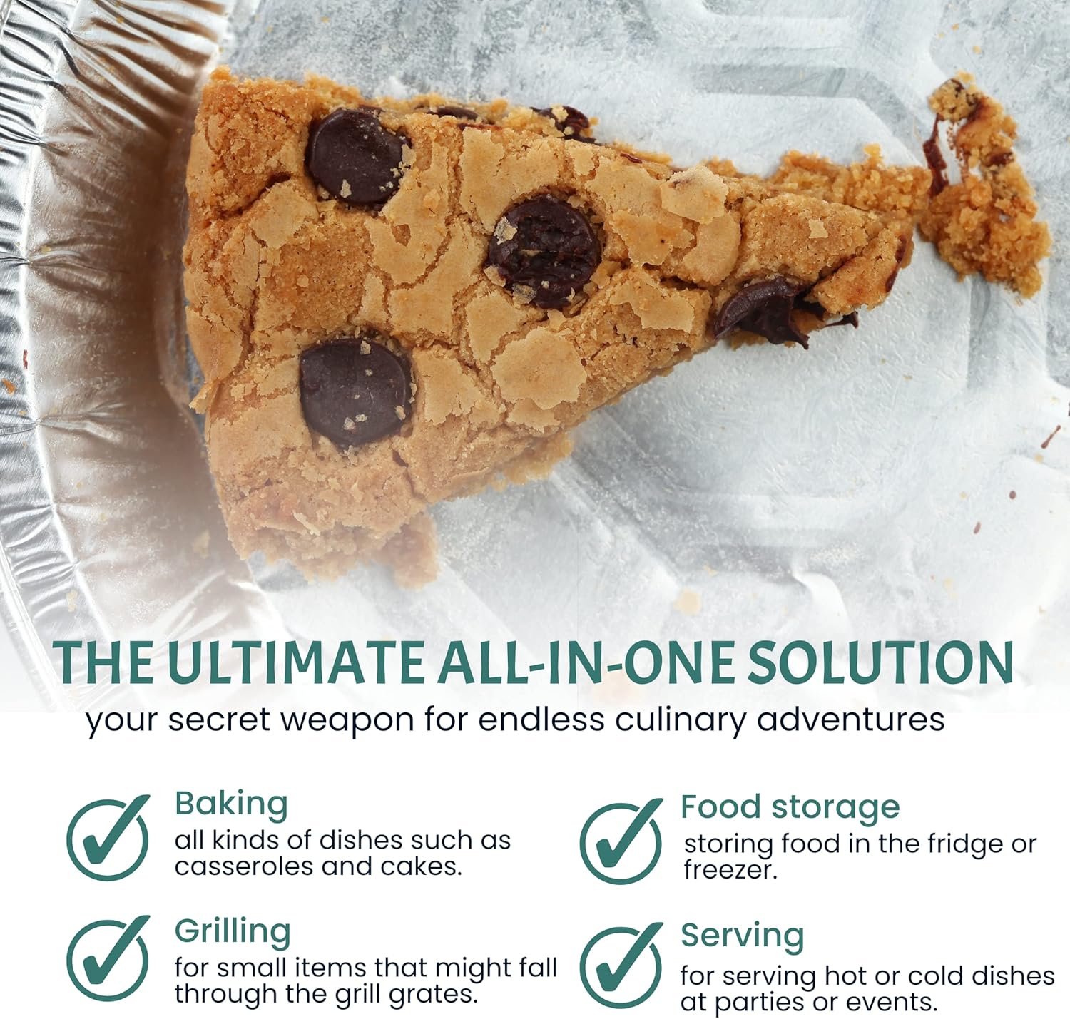 - 𝗨𝗽𝗴𝗿𝗮𝗱𝗲 𝗬𝗼𝘂𝗿 𝗖𝗼𝗼𝗸𝗶𝗻𝗴 𝗚𝗮𝗺𝗲 - With our lightweight and durable tin foil baking pans and aluminum foil pie pans made of premium quality thick aluminum foil with high side walls, ensuring a mess-free and enjoyable cooking experience every time!
