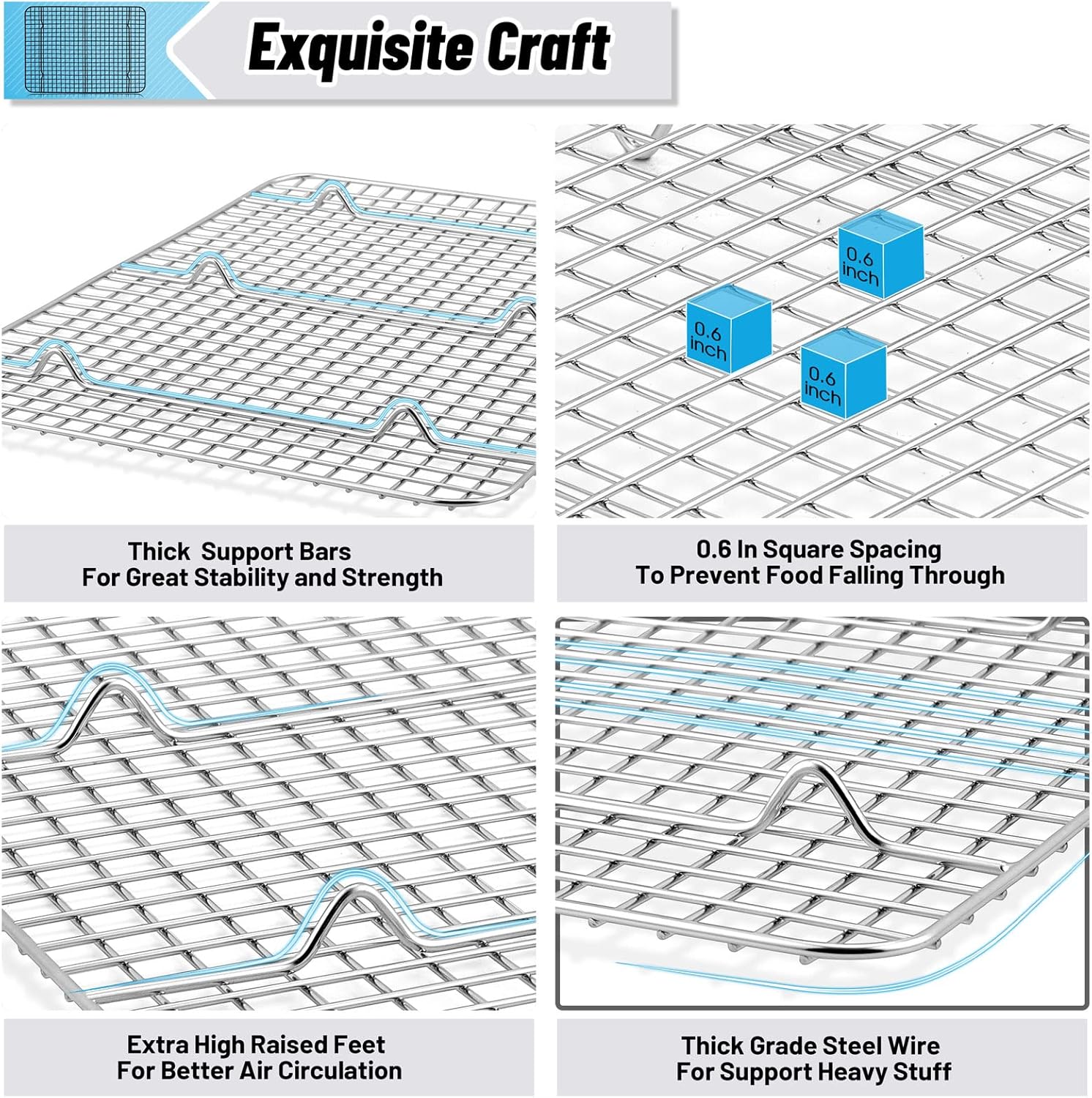 - Cooking Evenly & Quickly: The cooking rack with 0.6” x 0.6” grid spacing let grease drip through while avoiding the food from falling off, 0.75 inch elevated feet raised the entire rack up, Helps create proper air circulation for evenly baking and quickly cooling, Heavy gauge wires are able to withstand both hot and cold temperatures, Perfect for all types of use
