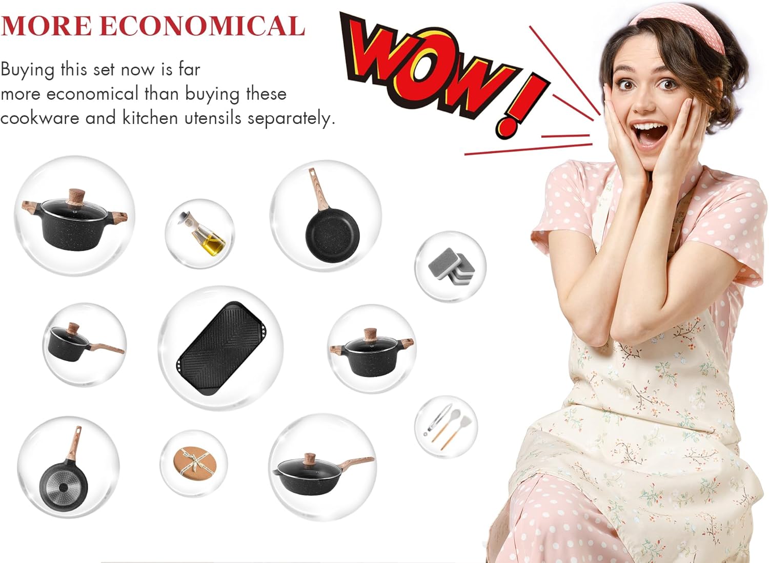 Caannasweis Granite Pots and Pans, Nonstick Cookware Set (Classic Black, 20 Piece Grill Griddle Set)