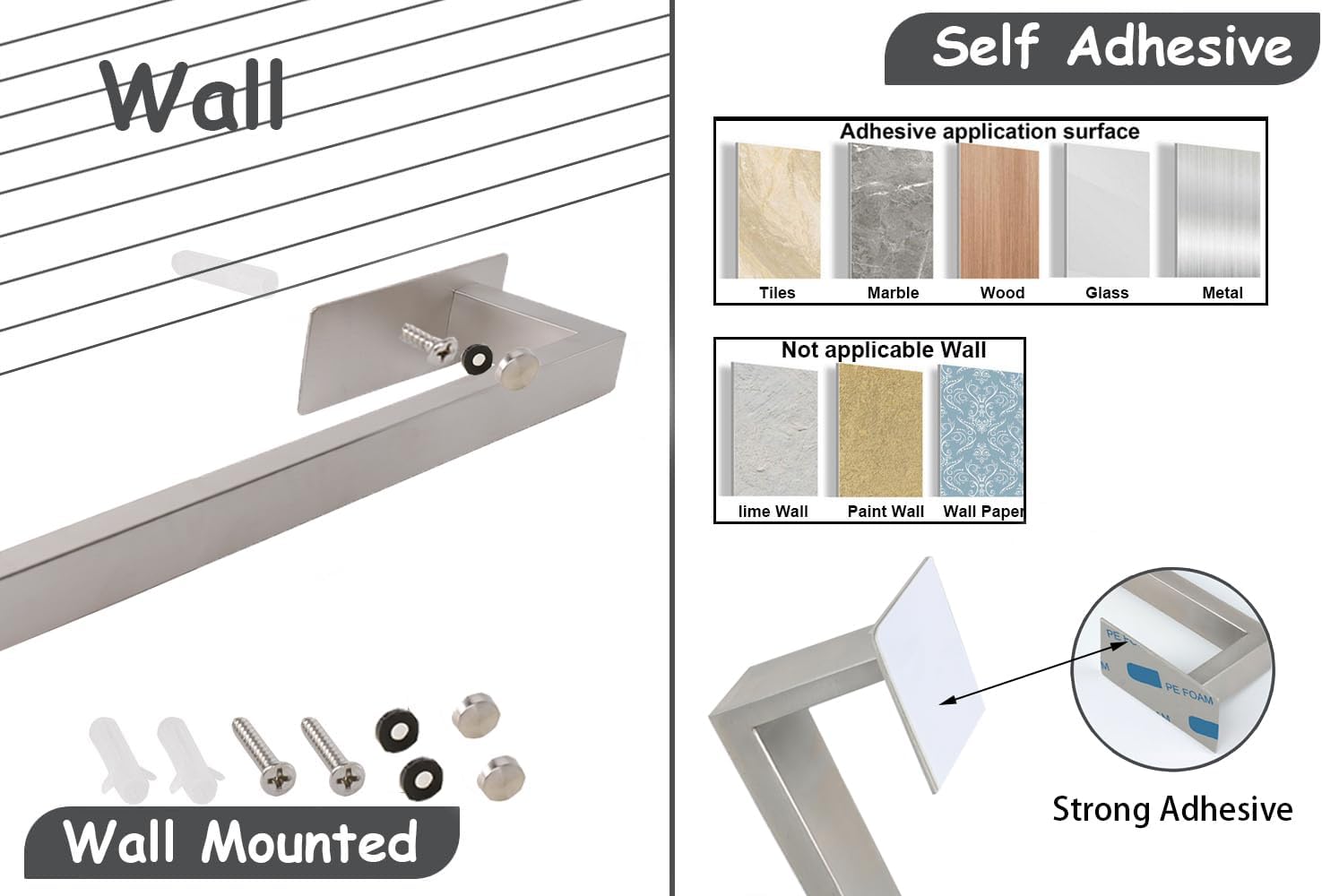 - EASY INSTALLATION: Towel holder has 2 mounting methods, adhesive or screw in, you can choose one of them according to your usage.. We provide detailed installation instructions in the package. Even if you don't have any “hands-made” experience, you can follow the installation instructions to complete the installation quickly. NOTE--Only suitable for installation on tile, marble, glass, stainless steel walls, not suitable for wallpaper, drywall, painted walls and other non-smooth walls.(Will tear off your wall)