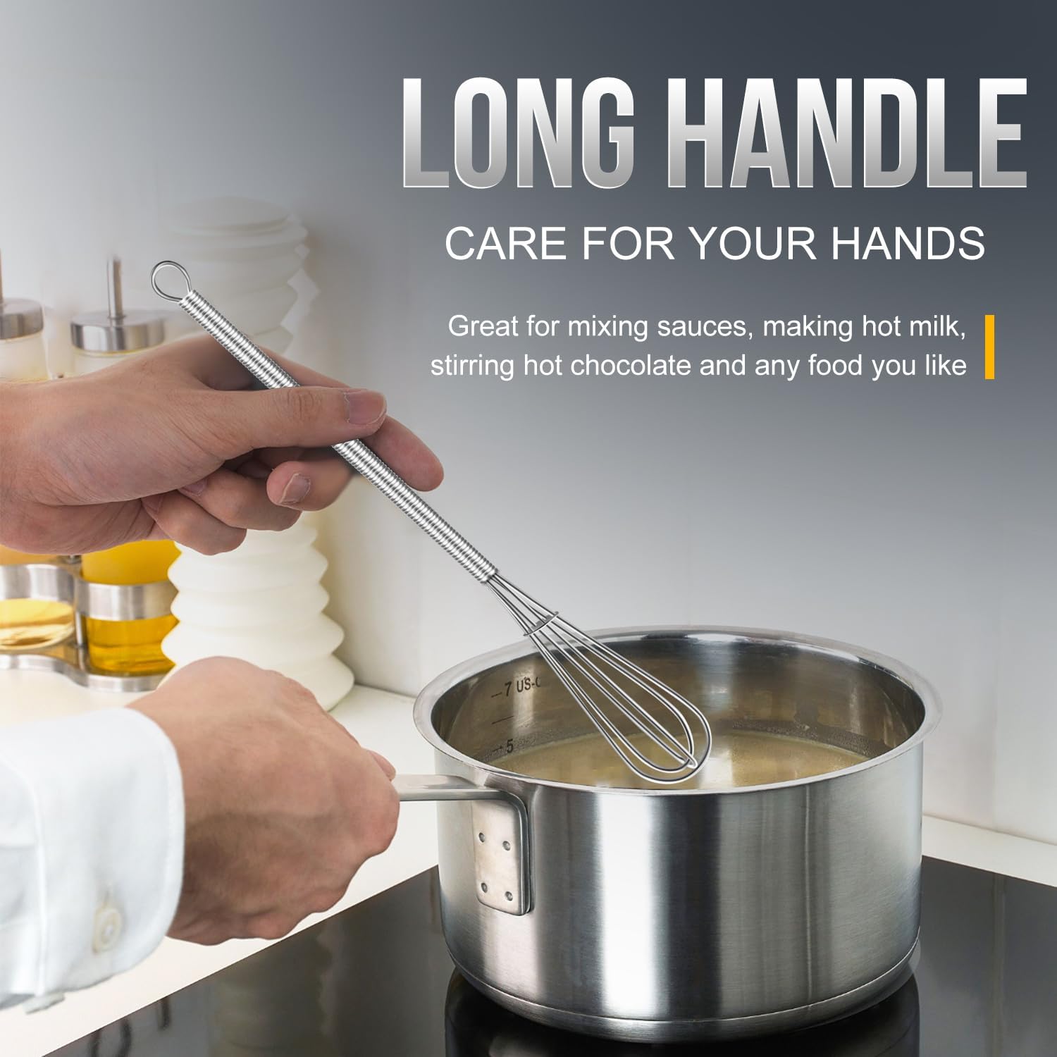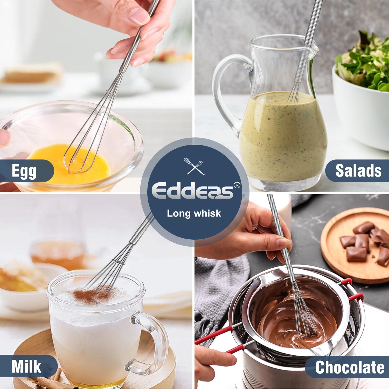 - The Eddeas Long handle Whisk has a wide range of applications in everyday life, use it to mix dry ingredients, stir sauces, make hot chocolate, eggs and any food you like.