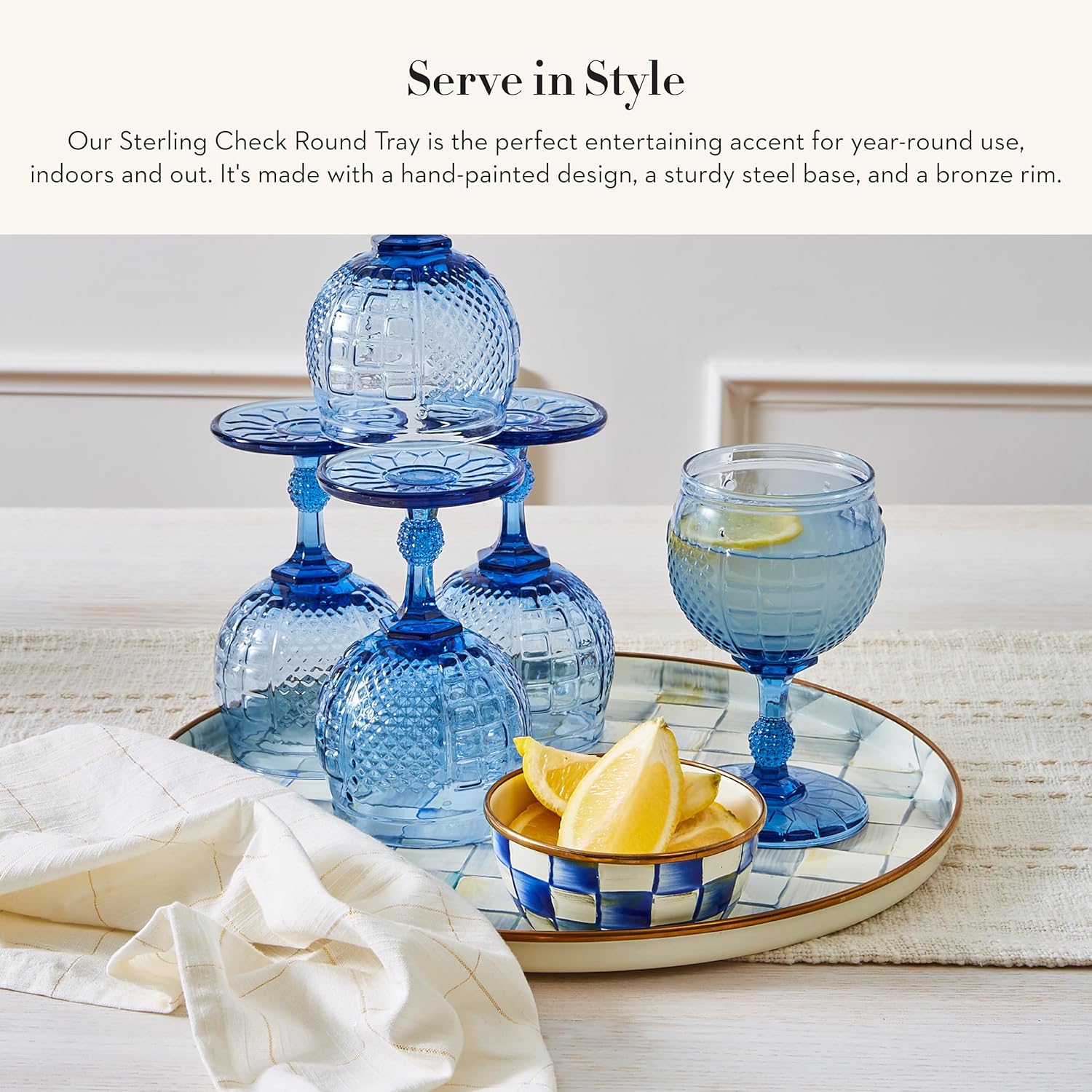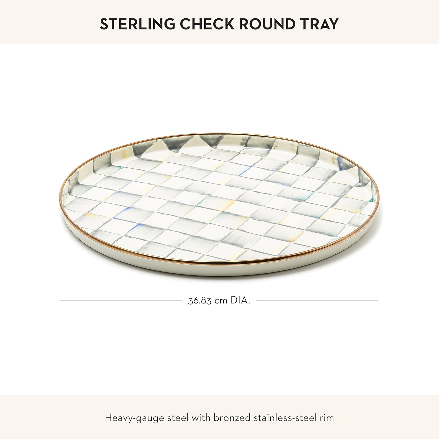 - ELEGANT SERVING ESSENTIAL: Serve anything in style with the Sterling Check round decorative tray, featuring a subtle jewel-toned palette woven by an artisan’s brush through glossy hand-painted gray-and-white checks on a sturdy steel underbody.