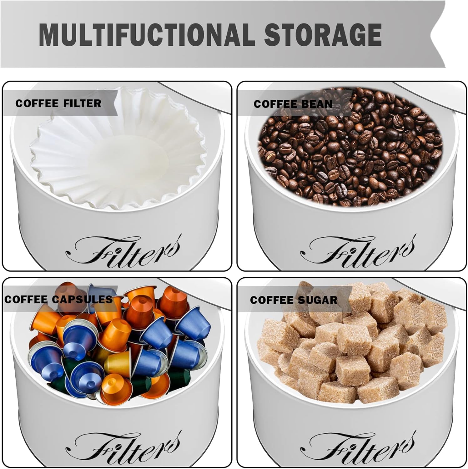- 【STURDY & DURABLE COFFEE BAR DECOR】 Our coffee filter holder storage is made from food-safe, powder-coated galvanized steel and it won't break after long time of use. Smooth surface are straightforward to clean, wipe with a damp cloth. It is a nice decoration in your Kitchen Counter, coffee bar decor