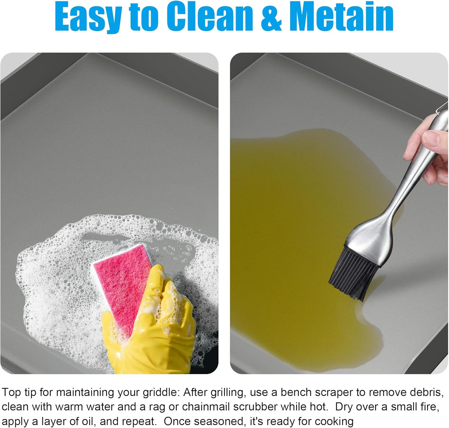 - Easy Cleaning & Storage: After cooking, you can wash your hands with hot water. Before storage, make sure to dry the griddle completely with a towel to evaporate any remaining moisture and prevent rust. If you need to store the griddle for an extended period, it is recommended to apply a thick layer of cooking oil, which acts as a barrier against air and moisture. Then wrap it in a plastic bag and store it in a dry place