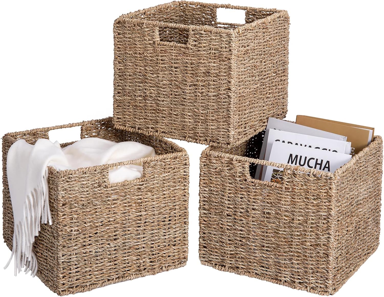 Seagrass Storage Baskets, 12X12X10in Cube Wicker Storage Basket for Shelves, Pantry Baskets Organization and Storage, Kitchen Storage Baskets, Bathroom Shelves Storage Basket Set of 3
