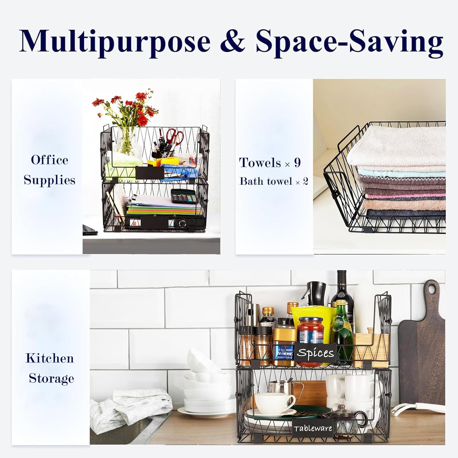 - 【Stackable Design】Single large size: 16.14’’x 11.61’’x 7.67’'.wire baskets can be stacked one on top of the other. You can adjust them at any time, which provides great flexibility and convenience. Use them on desks, counters, or the floor to make your house look more organized and save more space.