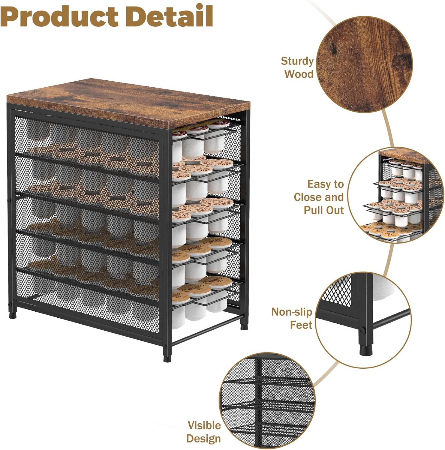 - 【Rustic and Sturdy Design】 : The coffee pod holder wooden top will firmly support your coffee maker or coffee brewer, durable and effective in preventing deformation. The stylish rustic style keurig pod holder blends into your office setting and kitchen decoration to spruce up your space.