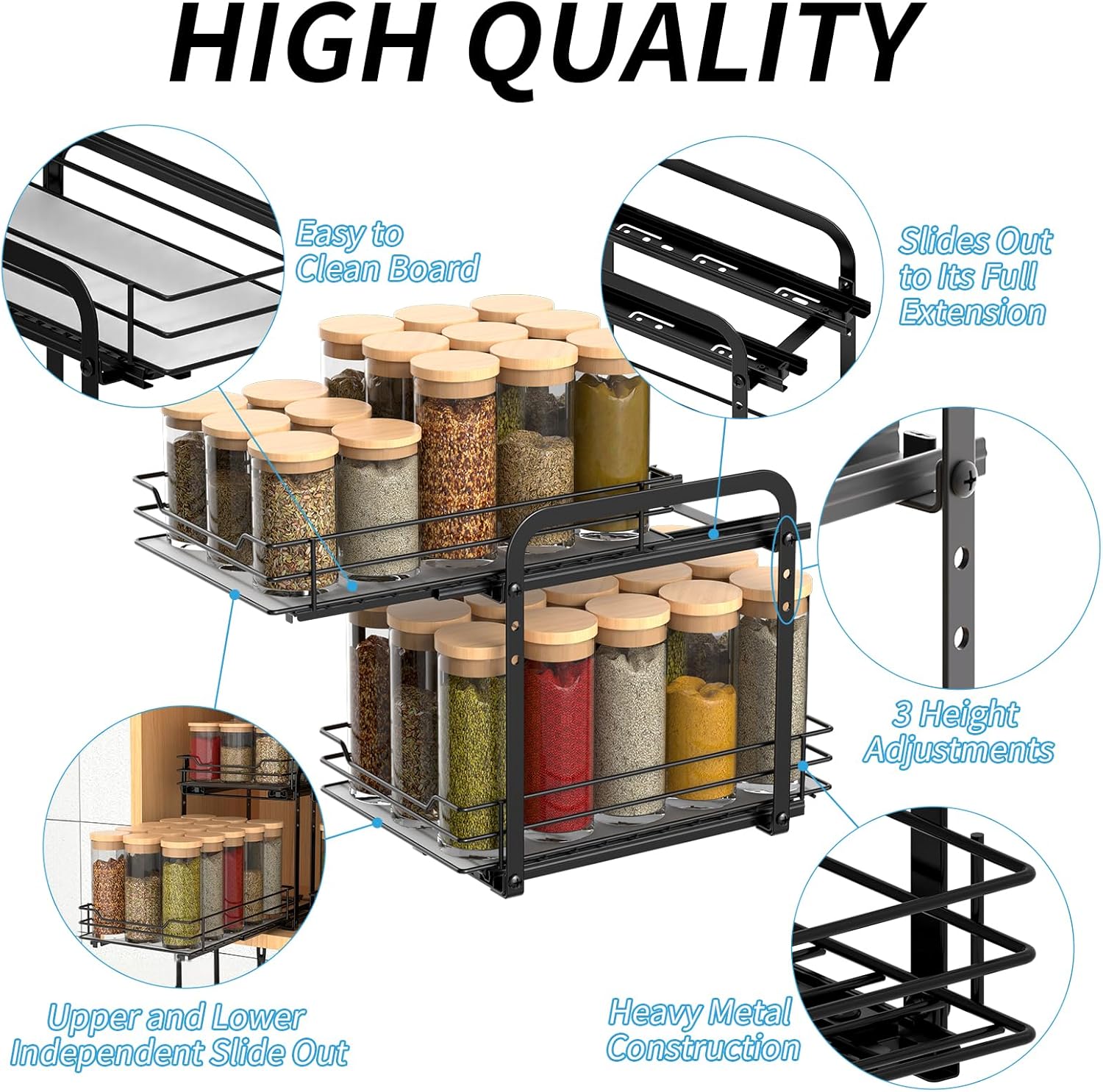 - Height Adjustable 2-Tier Pull Out Spice Rack: The BOIVSHI cabinet spice rack organizer is height-adjustable and can store more spice bottles of different sizes.