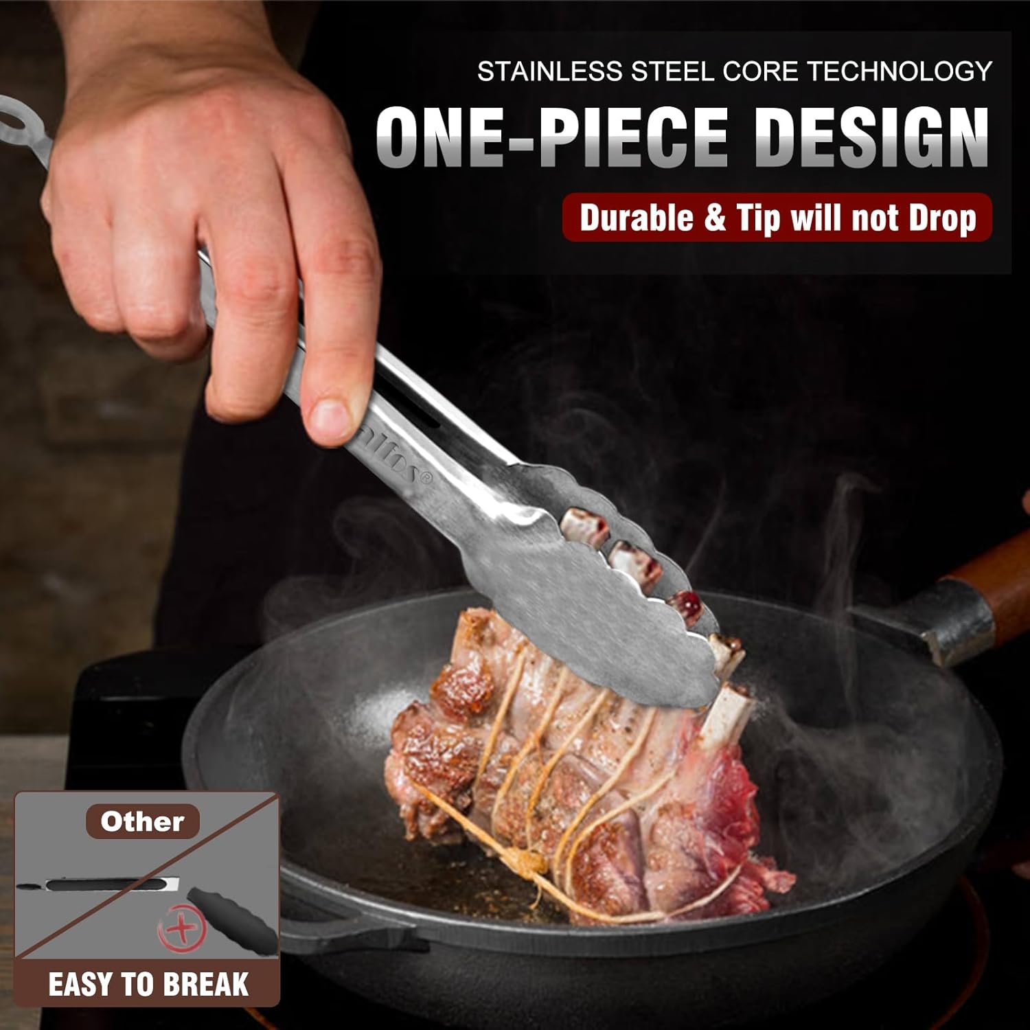 - FOOD GRADE AND STURDY STAINLESS STEEL- WALFOS Metal Kitchen Tongs are made from food grade Stainless Steel , food grade approved, anti-rust,light weight.Cooking tongs are made from a thick,1mm corrosion resistant food grade stainless steel for unbeatable strength and premium construction.Safe to touch food directly,good for health.