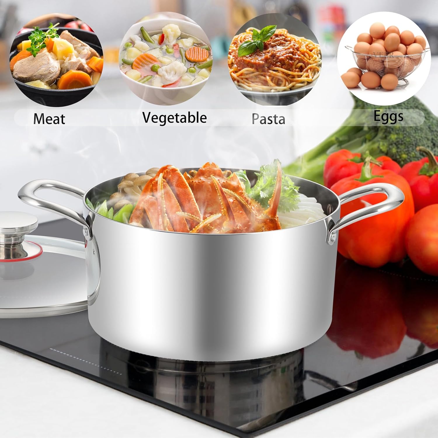 - TRANSPARENT LID & DOUBLE HANDLES - The stainless steel stock pot is equipped with a transparent glass lid, Conveniently monitoring your cooking process without opening to lock the nutrition of food, Vented hole on the cover lets excess steam escape to avoid spilling out, Stainless steel handles riveted on double sides help you hold comfortably and move stably