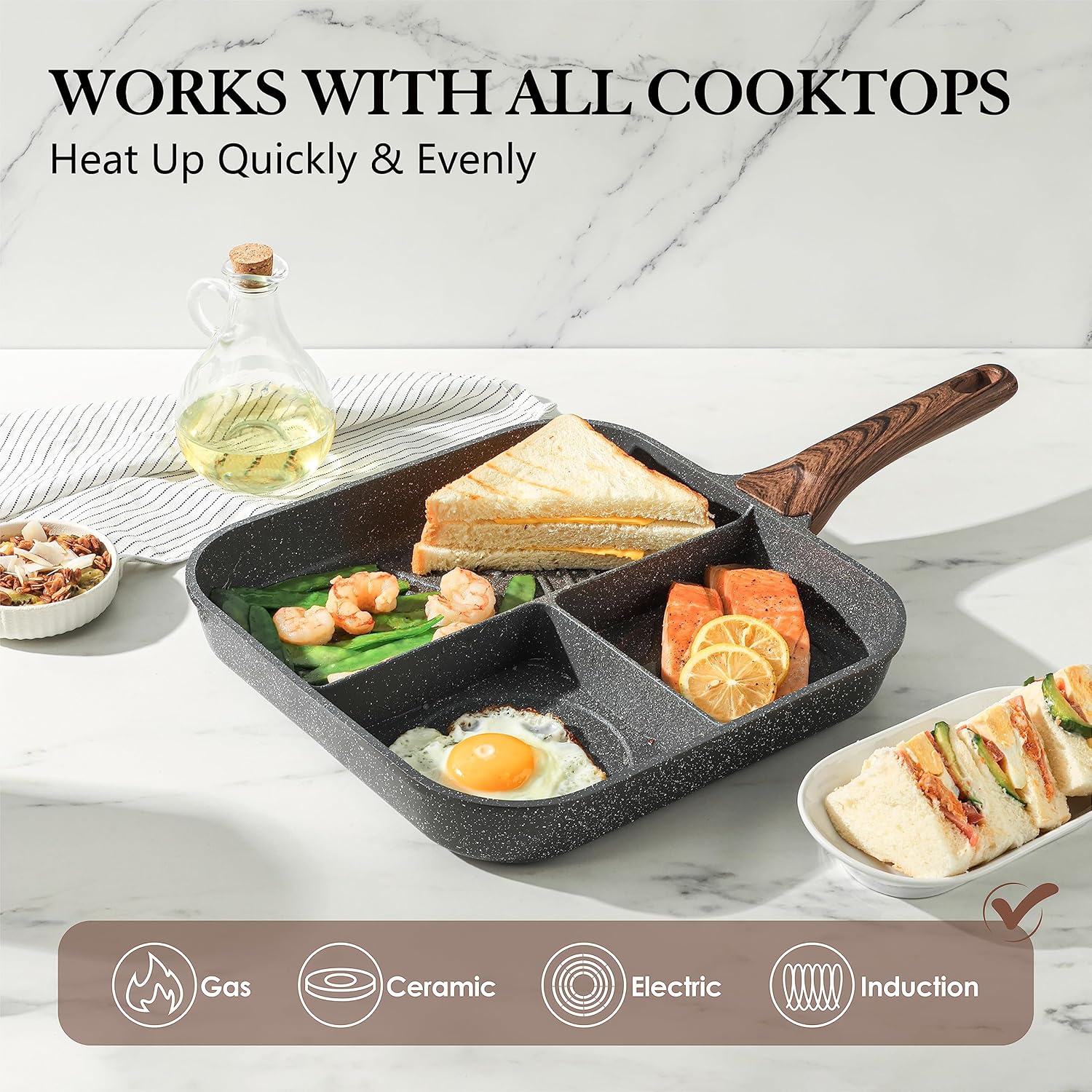 - Good for All Cooktops -This 3 section frying pan can be used on gas, electric, induction and glass or ceramic cooktops. The 4.5mm thick high magnetic conductivity stainless steel base helps distribute heat evenly and quickly.