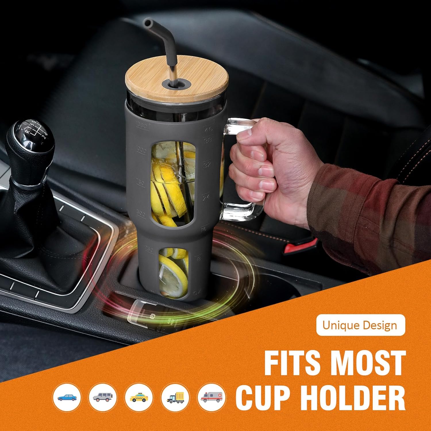 - DEVELOPED FOR CAR CUP HOLDERS-Glass cups with lids and straws specially designed for car cup holders. Perfectly sized designed to hold 46oz of hot tea and iced coffee. The smoothie cup can be safely placed in most car cup holders.