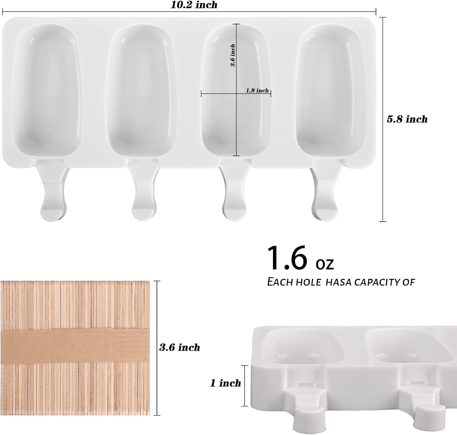 - Ice Pop Molds: cakesicle molds silicone is10.2" x 5.8" x 1.1", single cavity size is 1.9" x 3.6", can make 12 piece popsicles of the right size one time. with 100 pieces of popsicle sticks, nice combination and enough quantity for meeting your various kinds of ideas and needs