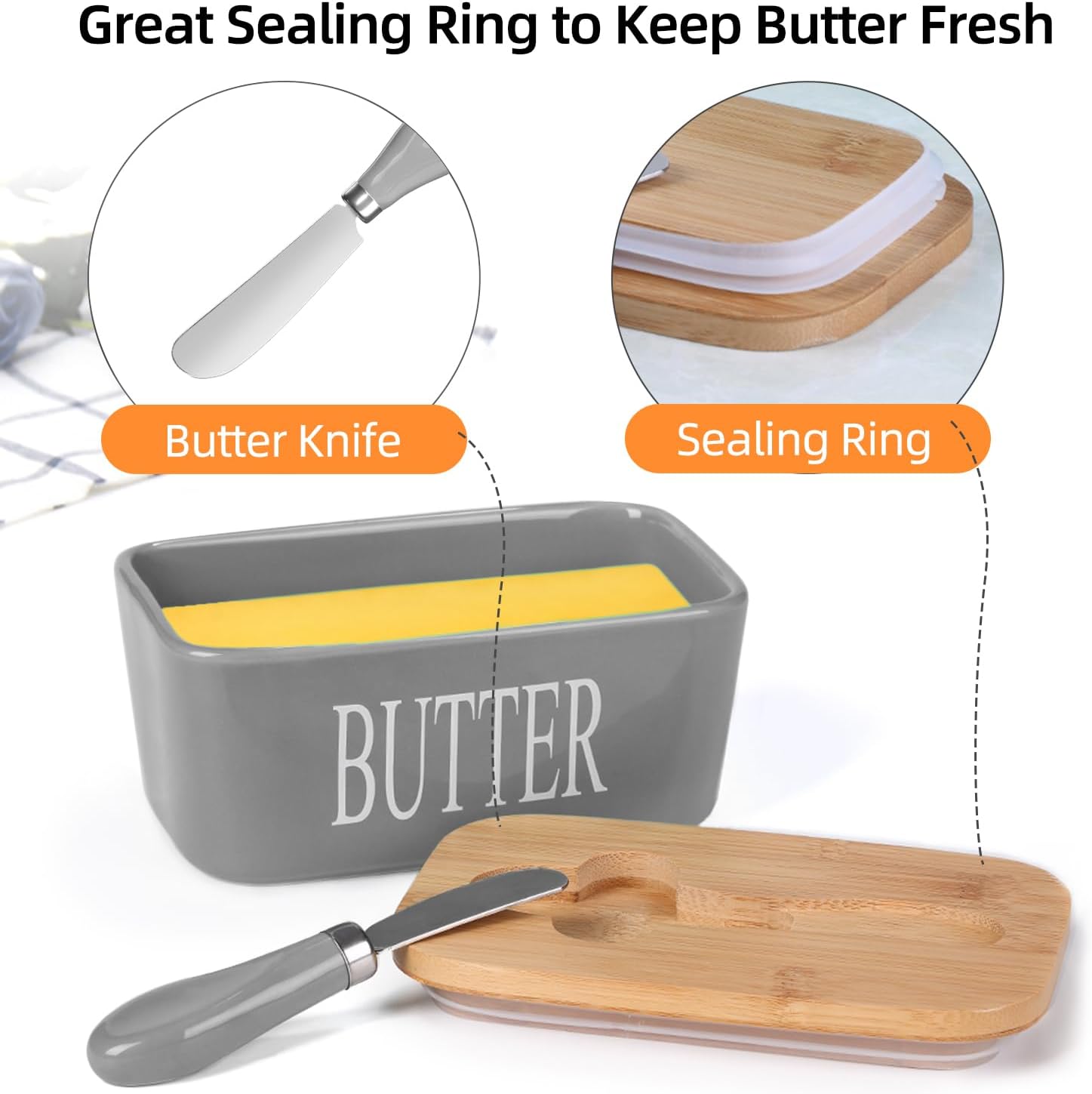 Ceramic Butter Dish with Wooden Lid, Large Butters Container Keeper Storage with Stainless Steel Knife Spreader, Bamboo Cover and Silicone Sealing Ring for West East Coast, Grey