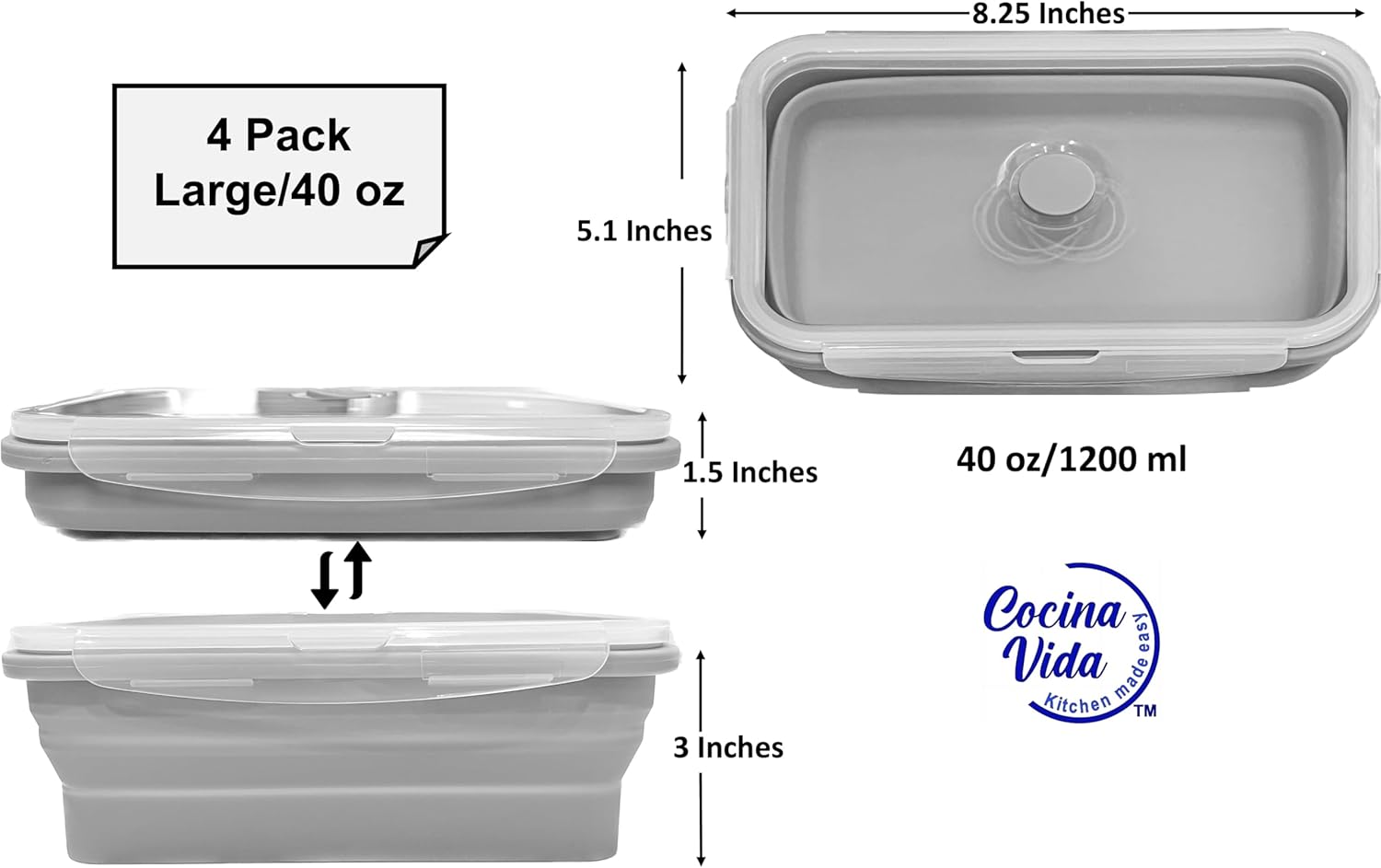 Cocina Vida Collapsible Silicone Food Storage Containers with Airtight Lids | Kitchen Stackable Lunch Box Microwave Dishwasher Safe| Set of 4 Silicone Food Storage Containers