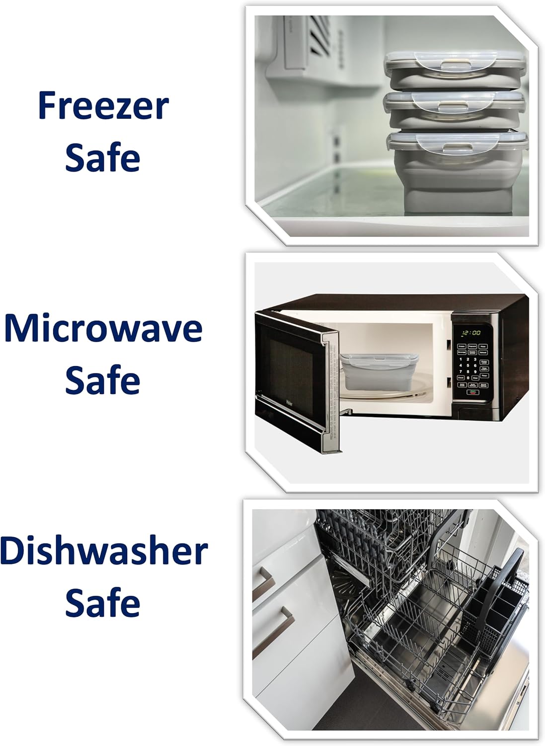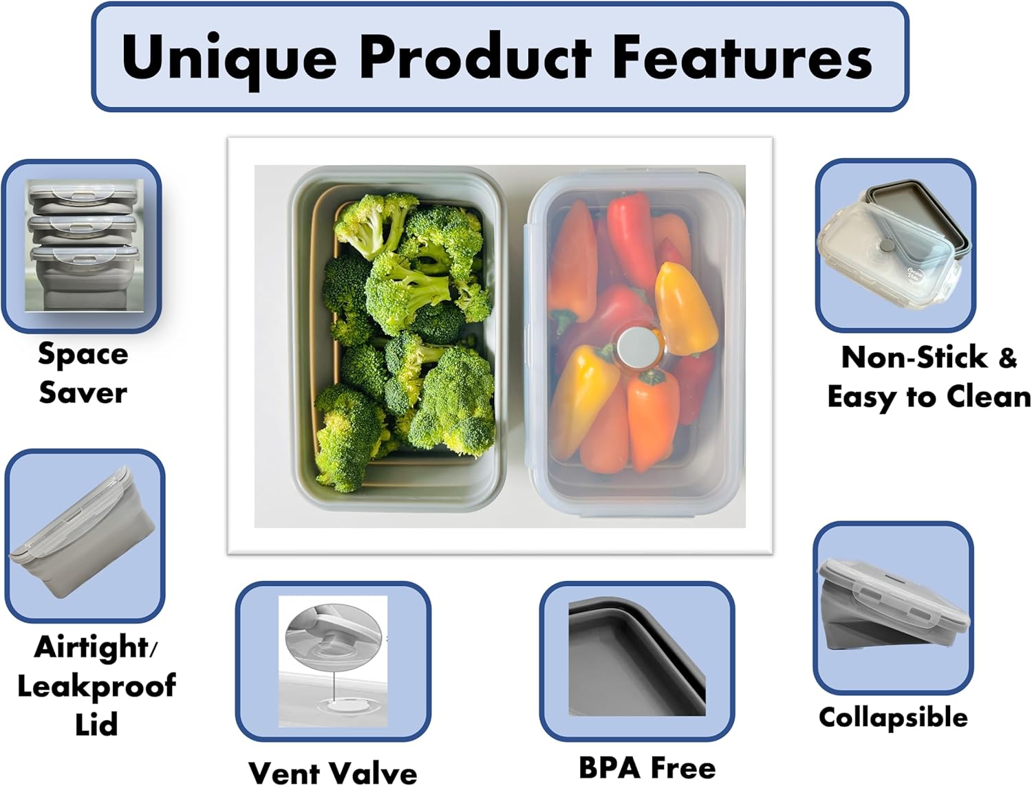 - These collapsible food storage containers with lids showcase a space-efficient design. Each storage container can be effortlessly folded to approximately half of its original size, ensuring convenient portability and storage. When unused, these containers can be stacked, effectively saving a significant amount of space.
