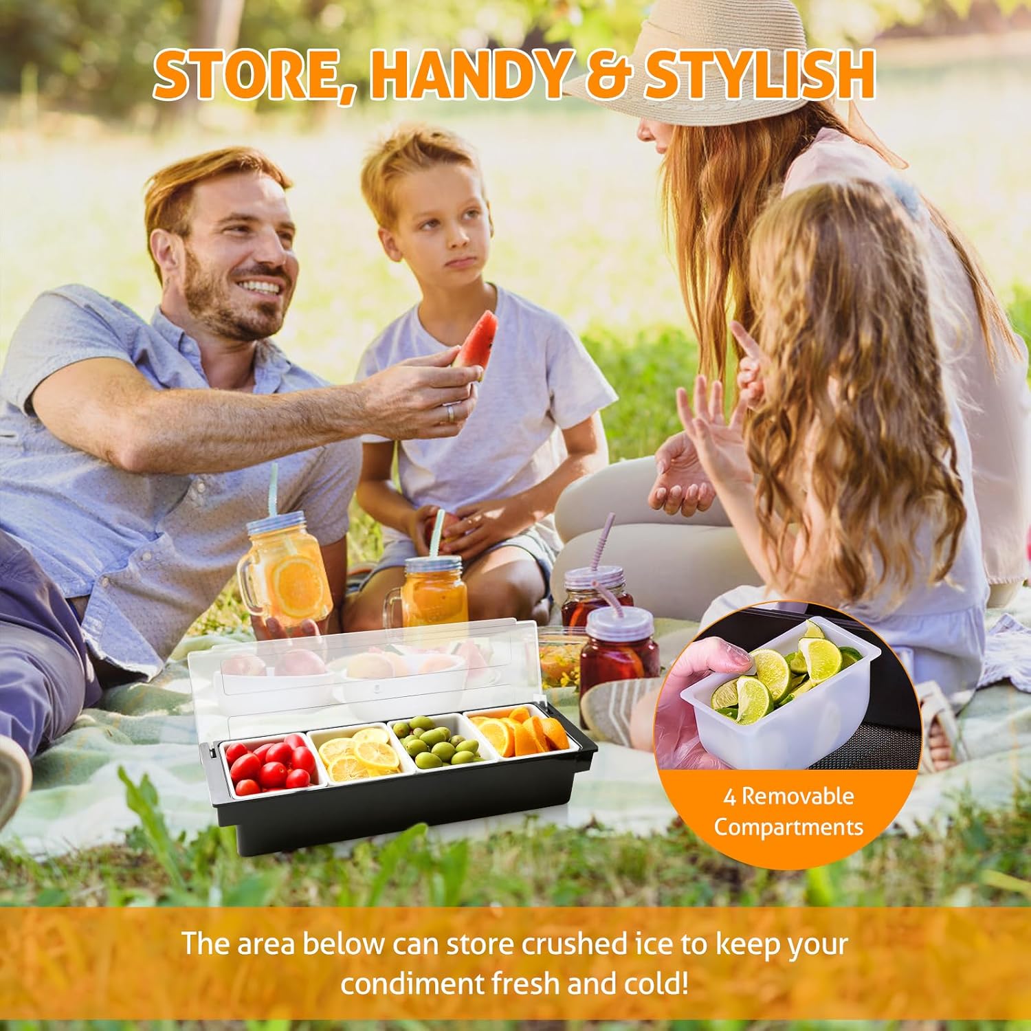 WICHEMI Fruit, Veggie & Condiment Caddy with Lid Dispenser Tray Garnish Station for Bartending & Serving Taco, Ice Cream, Salad Bar - Topping Organizer for Restaurant Supplies (4 Compartment, 2 Pack)