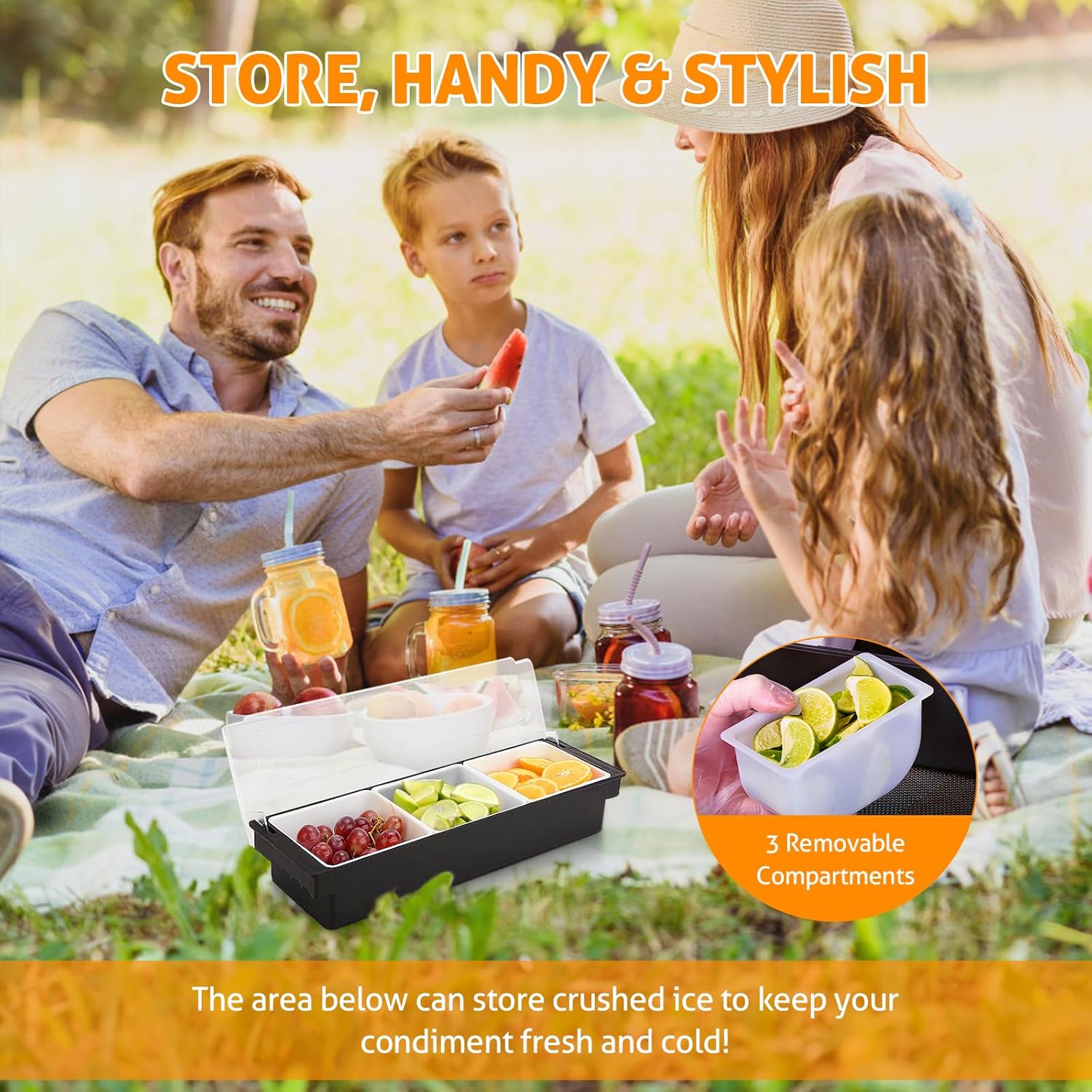 WICHEMI Fruit, Veggie & Condiment Caddy with Lid Dispenser Tray Garnish Station for Bartending & Serving Taco, Ice Cream, Salad Bar - Topping Organizer for Restaurant Supplies (3 Compartment, 2 Pack)
