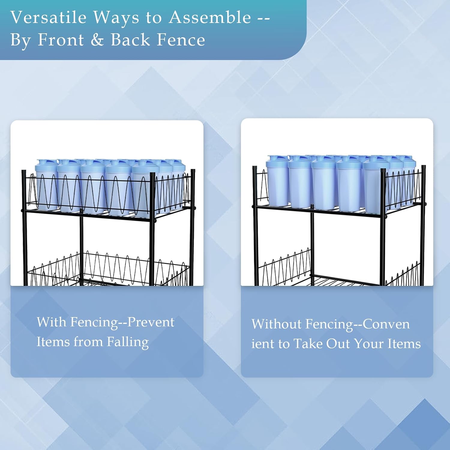 - 【What You Get】We provide you with numbered accessories, detailed instructions and necessary assembly tools to help you install this water bottle storage rack. The water rack provides more sufficient storage space in the kitchen, bathroom, living room, office, bedroom, dining room.
