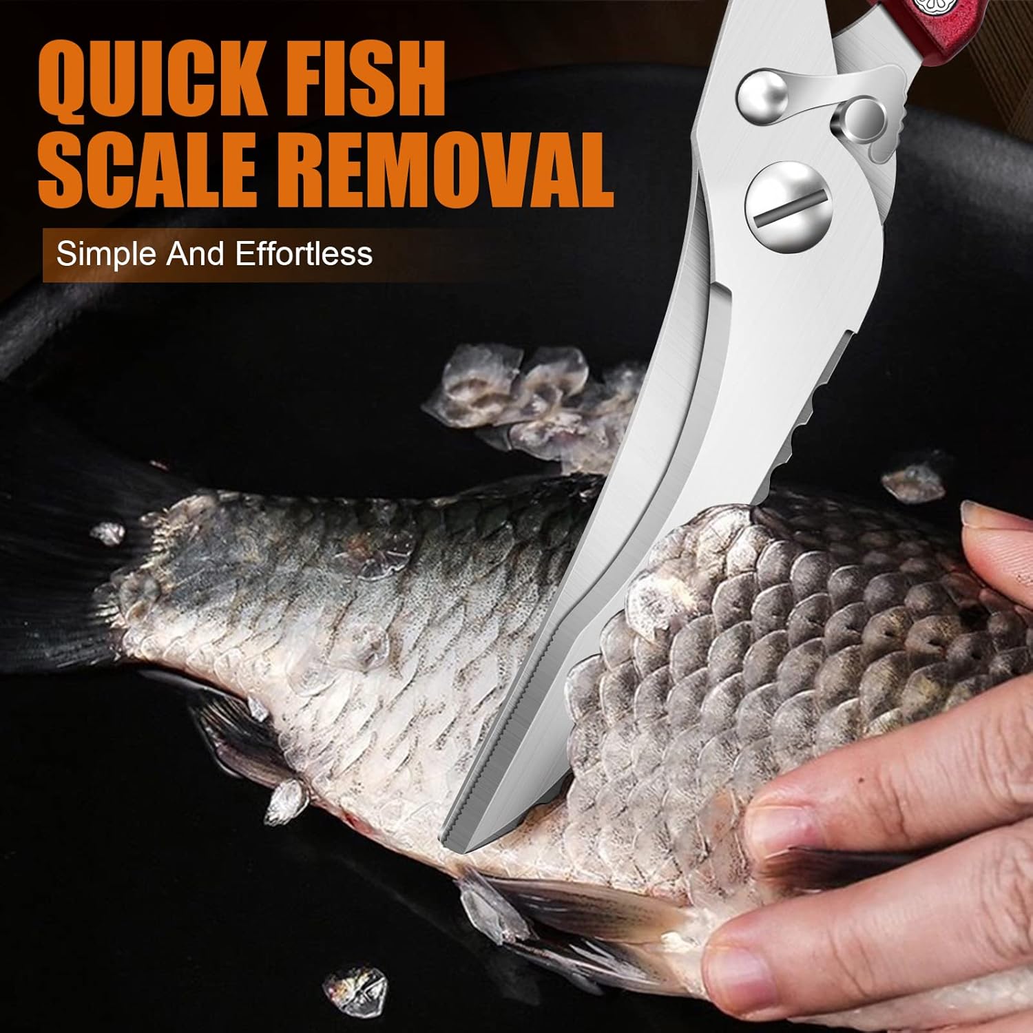 - 【PREMIUM QUALITY ULTRA-SHARP POULTRY SHEARS】The high-quality kitchen poultry shears forged from premium stainless steel are sharper and thicker. The blade of kitchen meat scissors is extremely sharp, and one of the blades with a serrated edge is suitable for scraping fish scales. It's effortless for kitchen chicken shears to slice through poultry, turkey wing, fish and cuts ingredients without slipping, which made it a vital role in the kitchen.