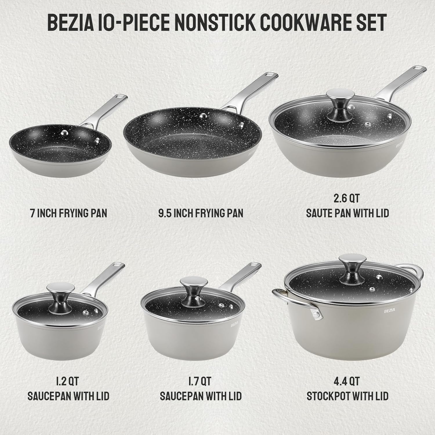 Induction Cookware Nonstick, BEZIA Pots and Pans Set for Induction Cooktop, Compatible with All Stoves, Dishwasher Safe Kitchen Cooking Pan Set with Frying Pans, Saucepans & Stockpot, 10-Piece (Grey)
