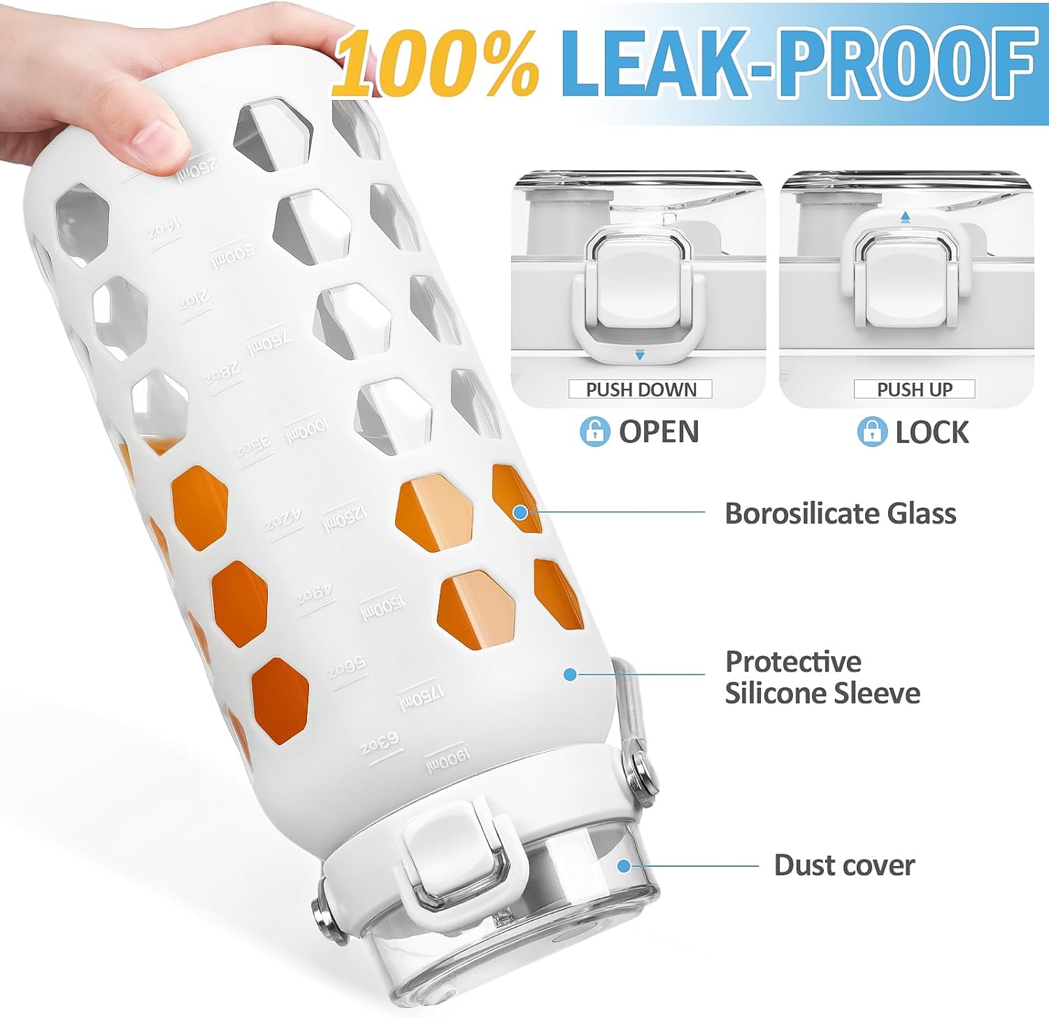 MUKOKO 64oz Glass Water Bottles with Straw and Lid,Half Gallon Water Bottle with Time Marker,Large Glass Water Jug with Silicone Sleeve and Stainless Steel Handle-White