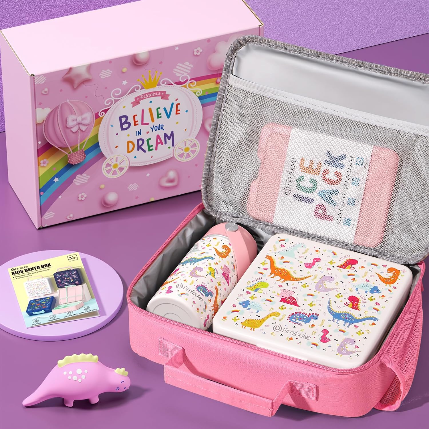Fimibuke Kids Bento Lunch Box with 4 Compartments, Insulated lunch Bag, Stainless Steel Insulated Water Bottle, Ice Pack & Utensils Set, Birthday Gifts for Ages 3-12 Back to School Toddler Girls Boys