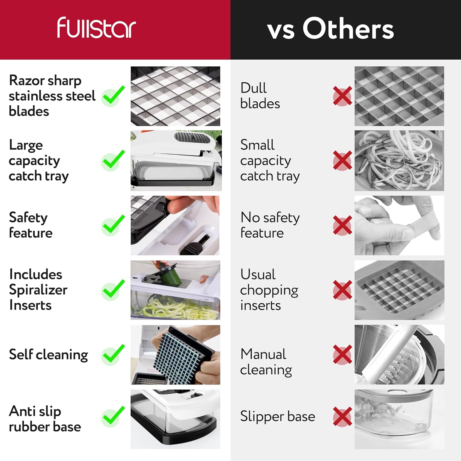 - Effortless Self Cleaning Feature - Our new feature makes cleaning a breeze - just push the release button, then the push button, and watch 99% of food residue disappear. Enjoy a hassle-free kitchen cleanup with our Fullstar chopper vegetable cutter!