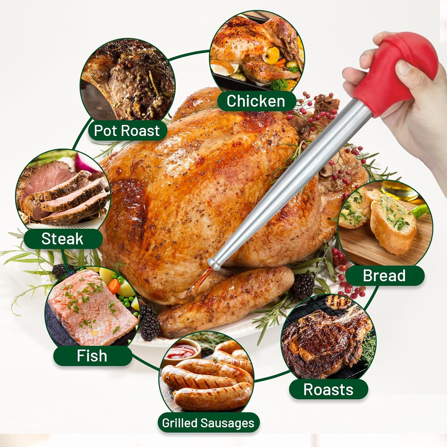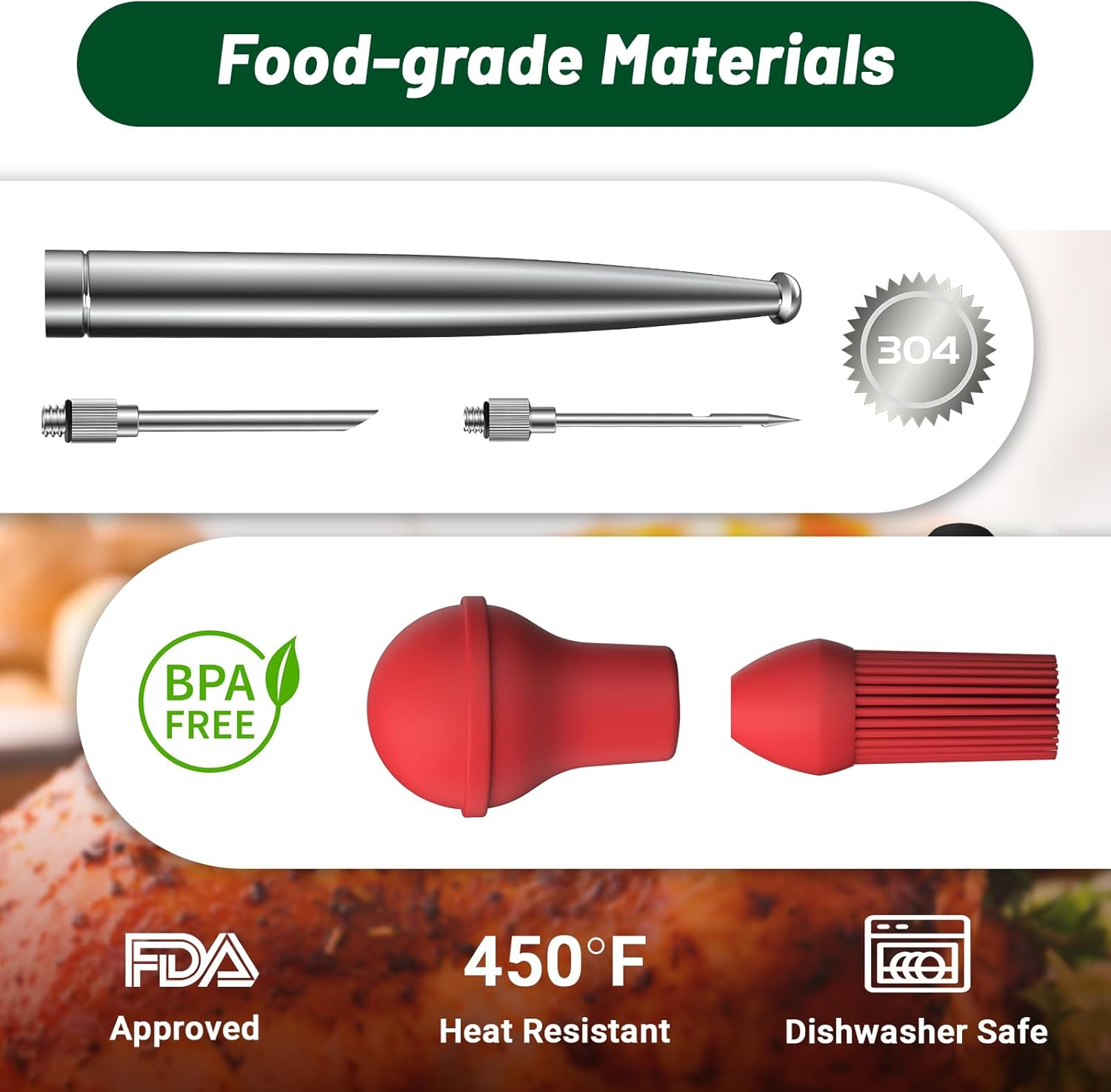 - 304 Stainless Steel Turkey Baster: This turkey baster syringe made of 304 stainless steel is built to last, you don’t need to worry about its melting or deforming as you baste your turkey or roast it with hot drippings, it is also stain-resistant and won’t rust or discolor, even when you’re using it with acidic juices containing citrus or tomatoes.