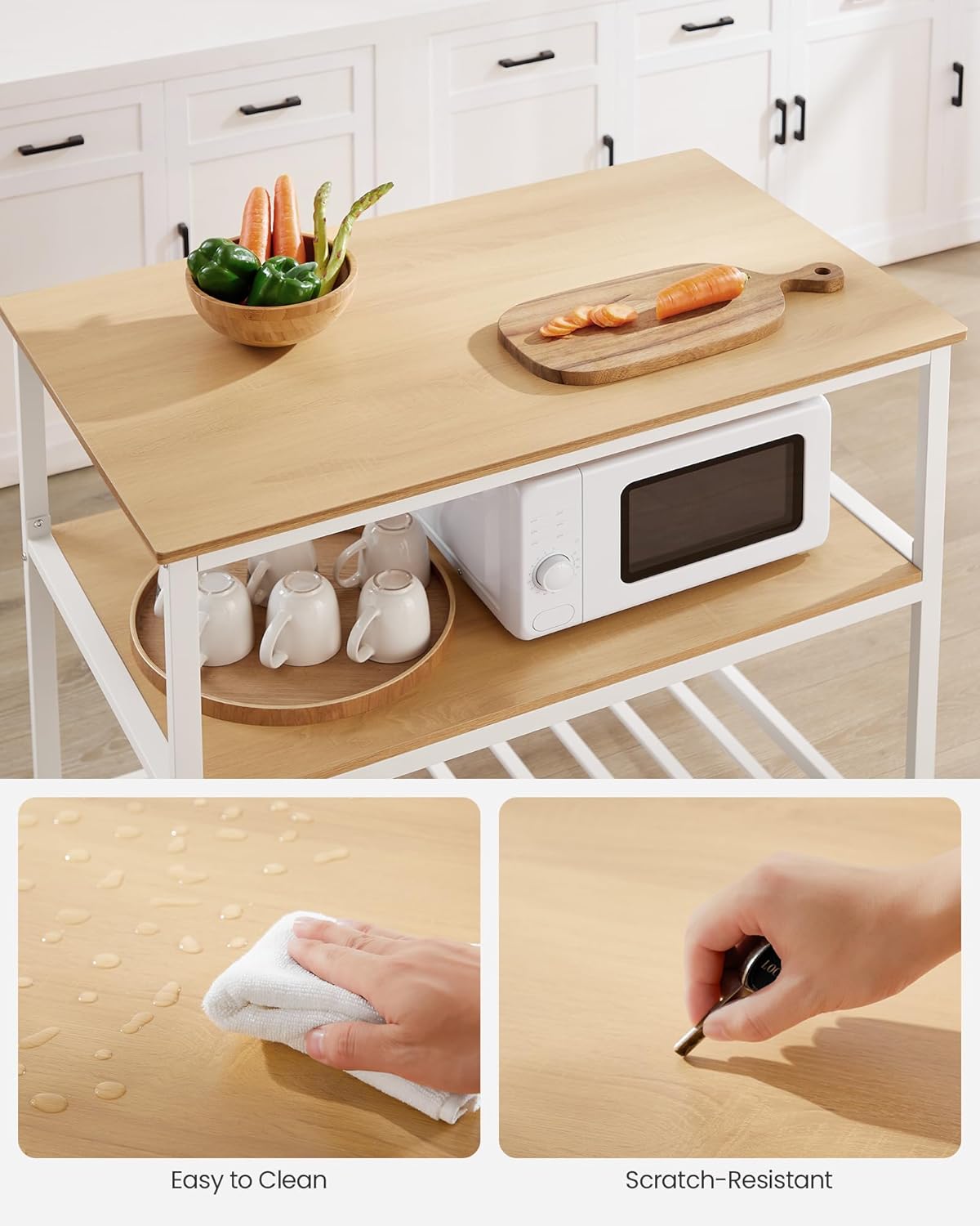 - [No Wobbles, No Scratches] Say bye to small annoyances—the adjustable feet prevent the kitchen island from wobbling on slightly uneven floors and protect your floor from unwanted scratches