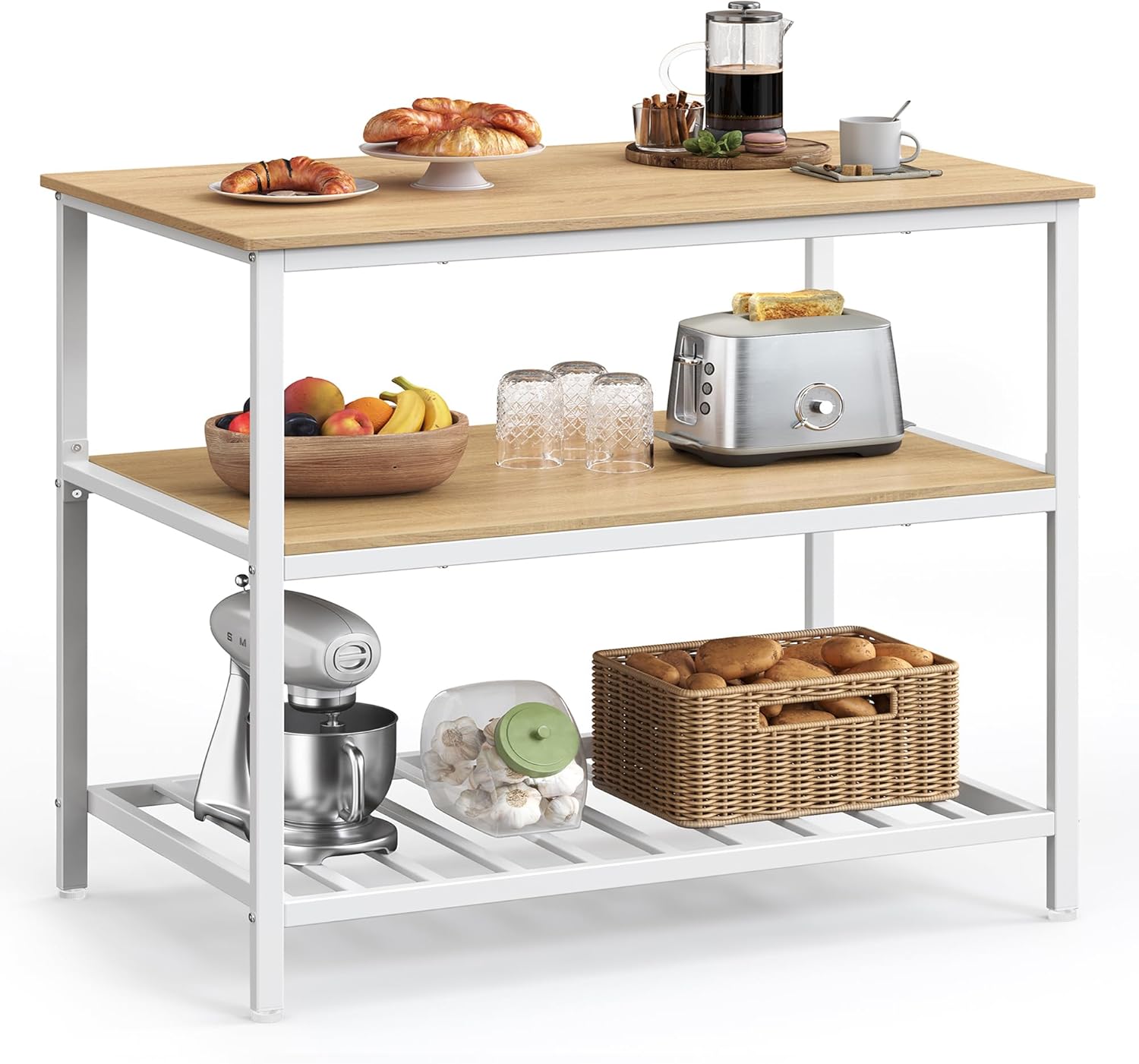 - [3-Tier Storage] Place a flower vase or a tea set on the top, kitchen appliances on the middle shelf, and storage boxes with bakeware on the lower grid shelf—everything is nicely organized on this 3-tier Island table with easy access