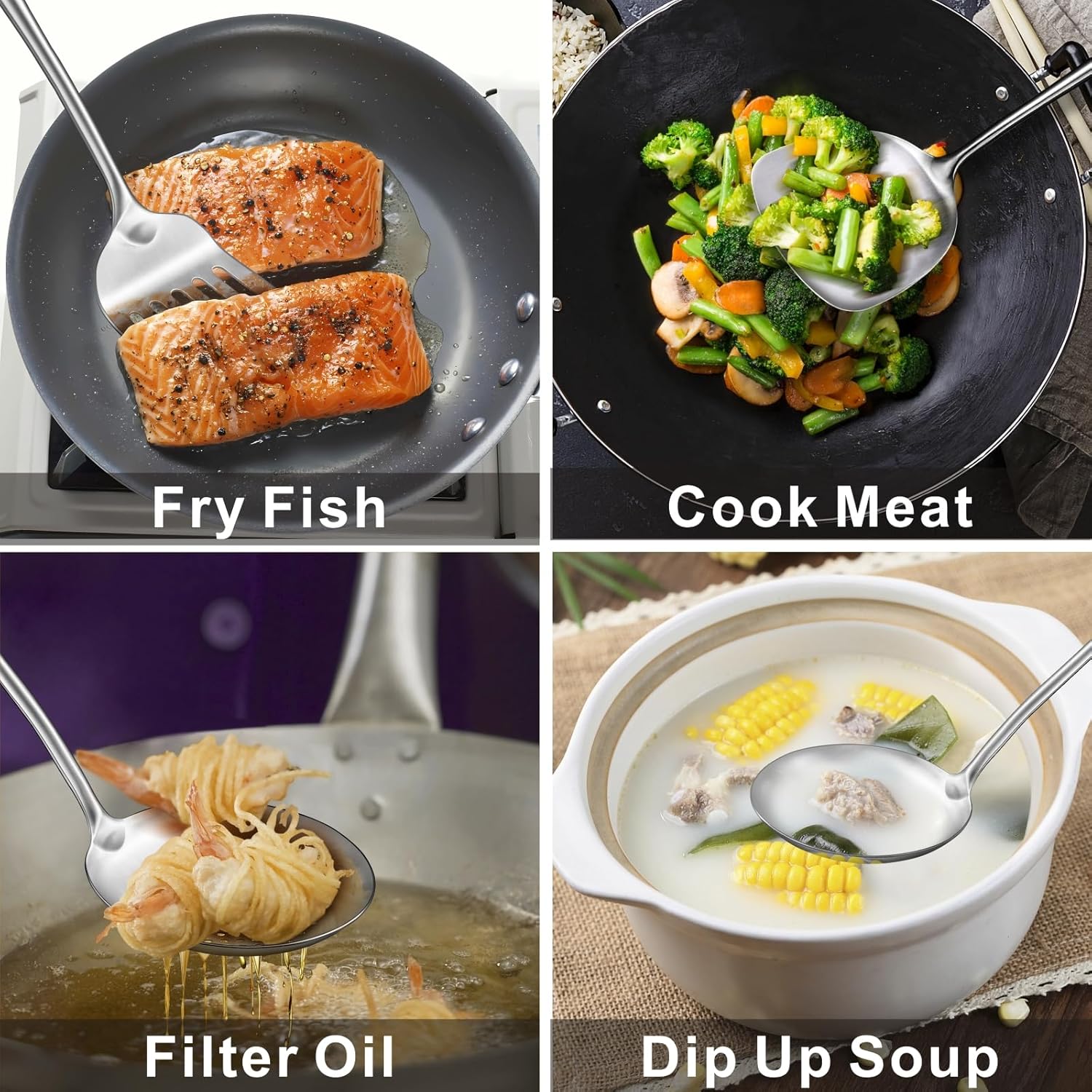 - 【4 PIECES Of 17" LONG WOK UTENSILS】 Extra long 17" skimmer, wok spatula, soup ladle and slotted turner, helps avoid burns or heat to your hands and knuckles.Long handle helps you flip fried food from a distance,avoid burning your hand. Ideal for home,outdoor picnic,BBQ,restaurant,hotel,commercial cooking.