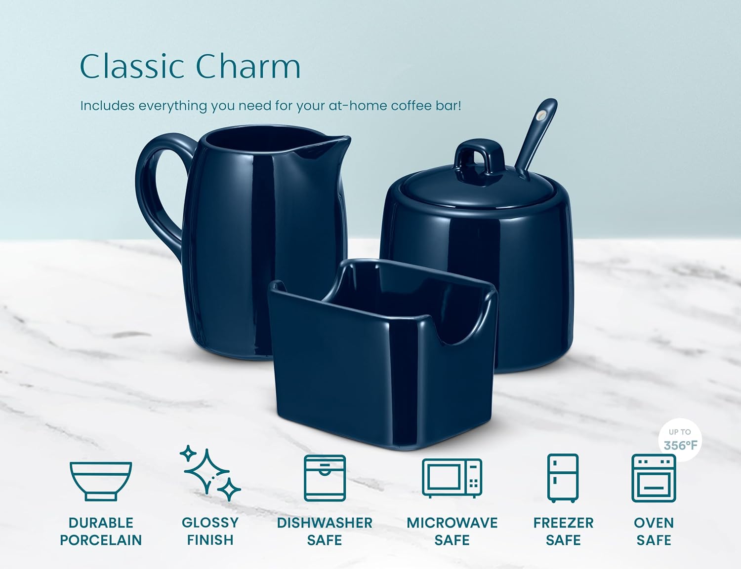 Kook Sugar and Creamer Set, 3 Piece, Pitcher, Sugar Bowl with Lid and Spoon, Sweetener Holder (Navy)