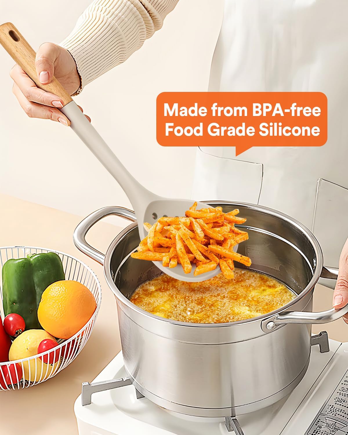 Kitchen Ladle Strainer, Large Slotted Spoon with High Heat Resistant BPA Free, Non Stick Cooking Skimmers For Draining & Frying, 13.2inch (Khaki)