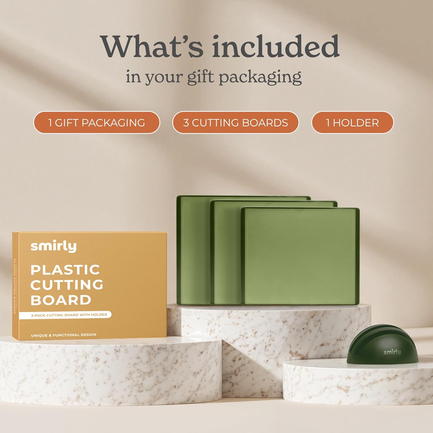 SMIRLY Plastic Cutting Board Set with Holder 3 Pieces, Non-Slip Dishwasher Safe Chopping Boards for Kitchen, Green
