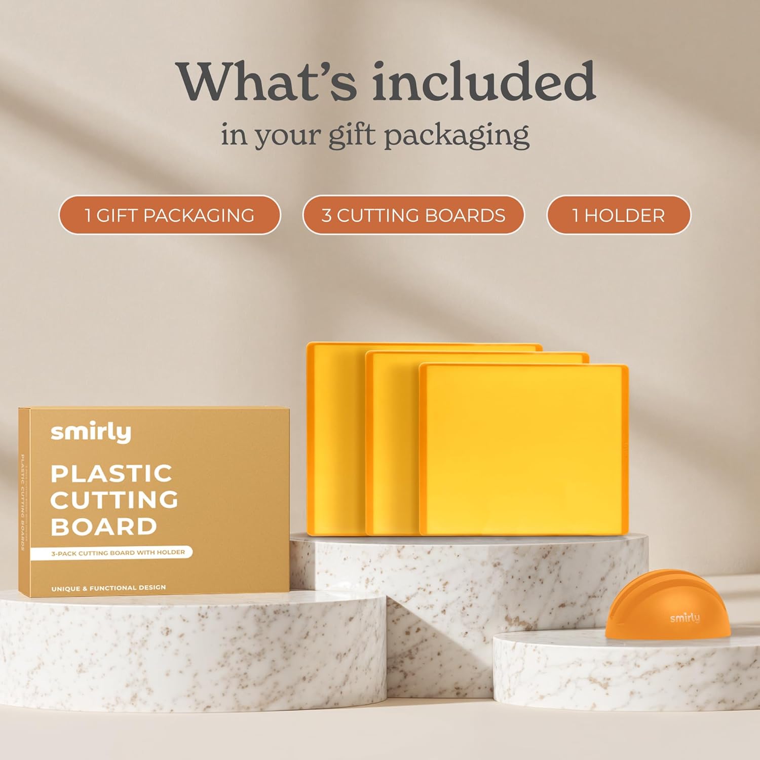 - 3-Pack with Holder: This cutting board set includes small, medium, and large cutting board sizes for every prep need. It also comes with a compact holder that neatly organizes all boards vertically, keeping your countertops clutter-free while ready for any chopping task.