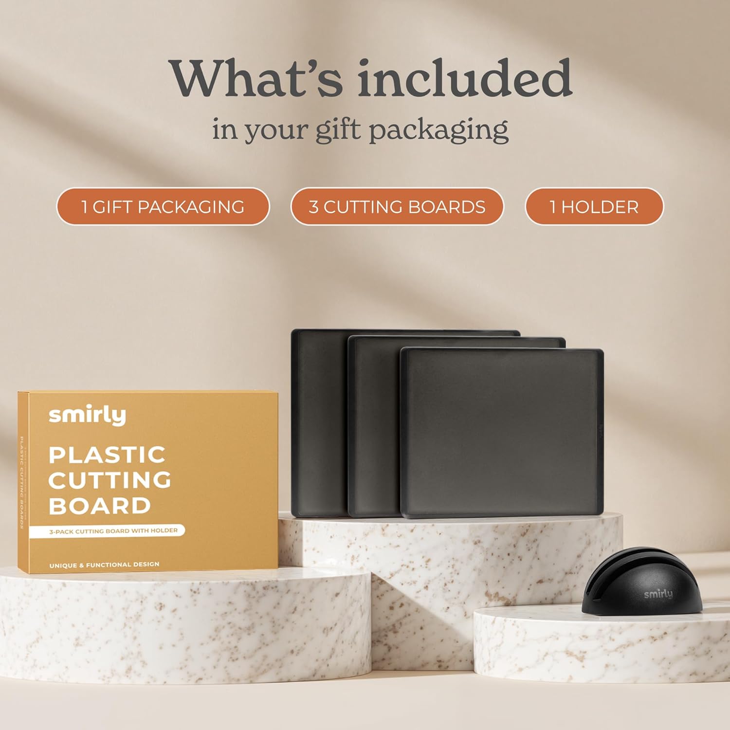 - 3-Pack with Holder: This cutting board set includes small, medium, and large cutting board sizes for every prep need. It also comes with a compact holder that neatly organizes all boards vertically, keeping your countertops clutter-free while ready for any chopping task.