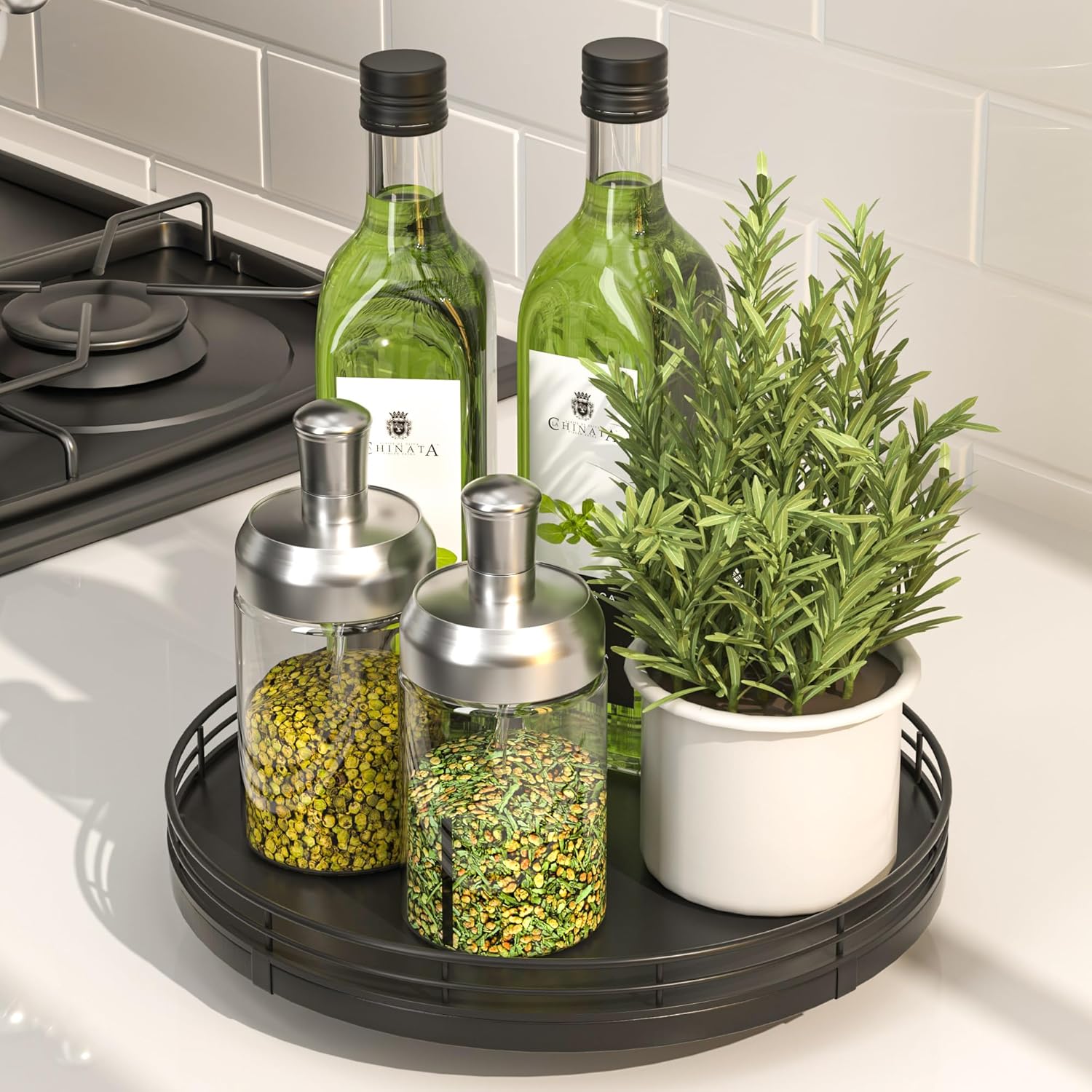 - ๐ง๐ต๐ผ๐๐ด๐ต๐๐ณ๐๐น ๐๐ฒ๐๐ถ๐ด๐ป: The turntable tray features a smooth and silent 360ยฐrotation; Bottom slip-resistant pads for stability and protect your countertop from scratches; Raised edges on each organizer tray to keep items from falling out; Easy to use, no installation required