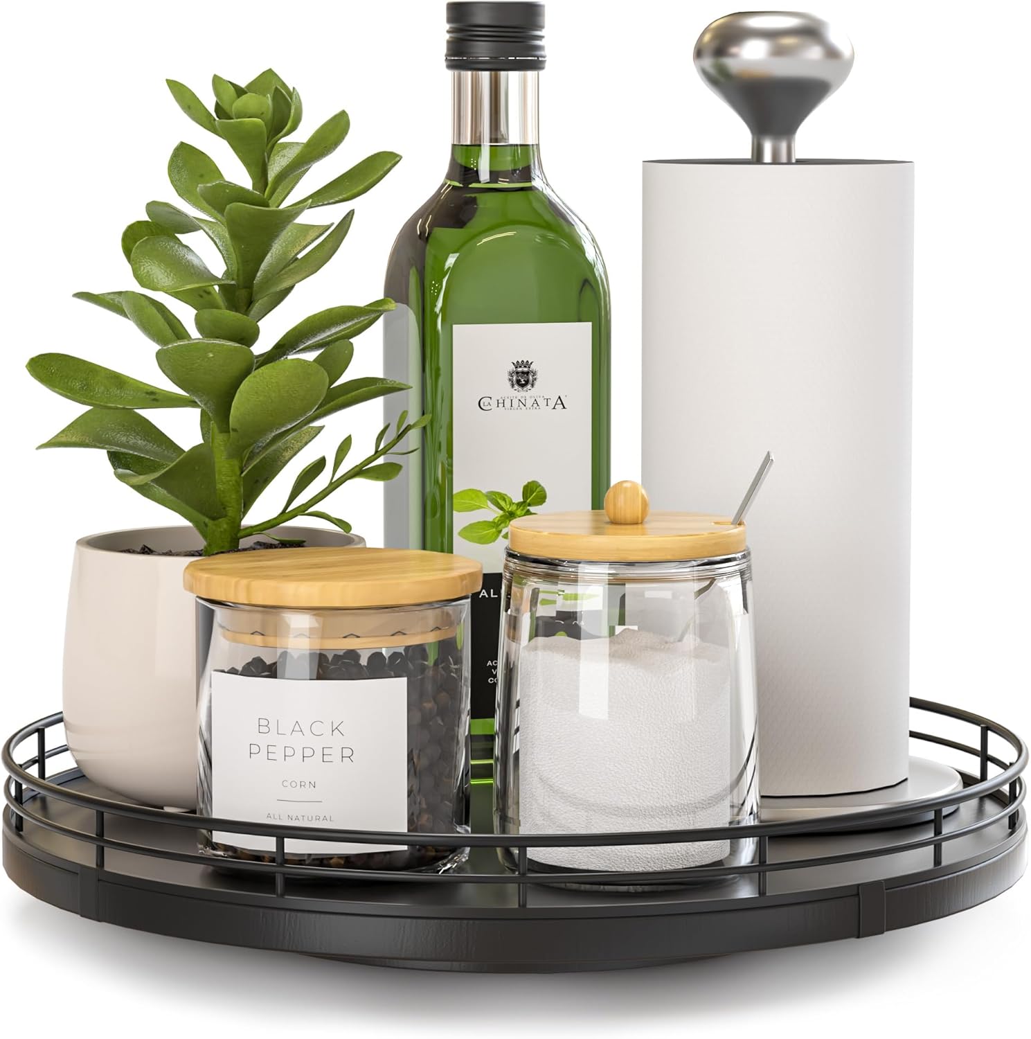 10" Oak Wood Lazy Susan Turntable Organizer, Lazy Susan for Cabinet Dining Table Pantry Kitchen Countertop Spice Bathroom Vanity Tray for Counter Dresser Sink Soap Holder Coffee Table Bar Decor Black