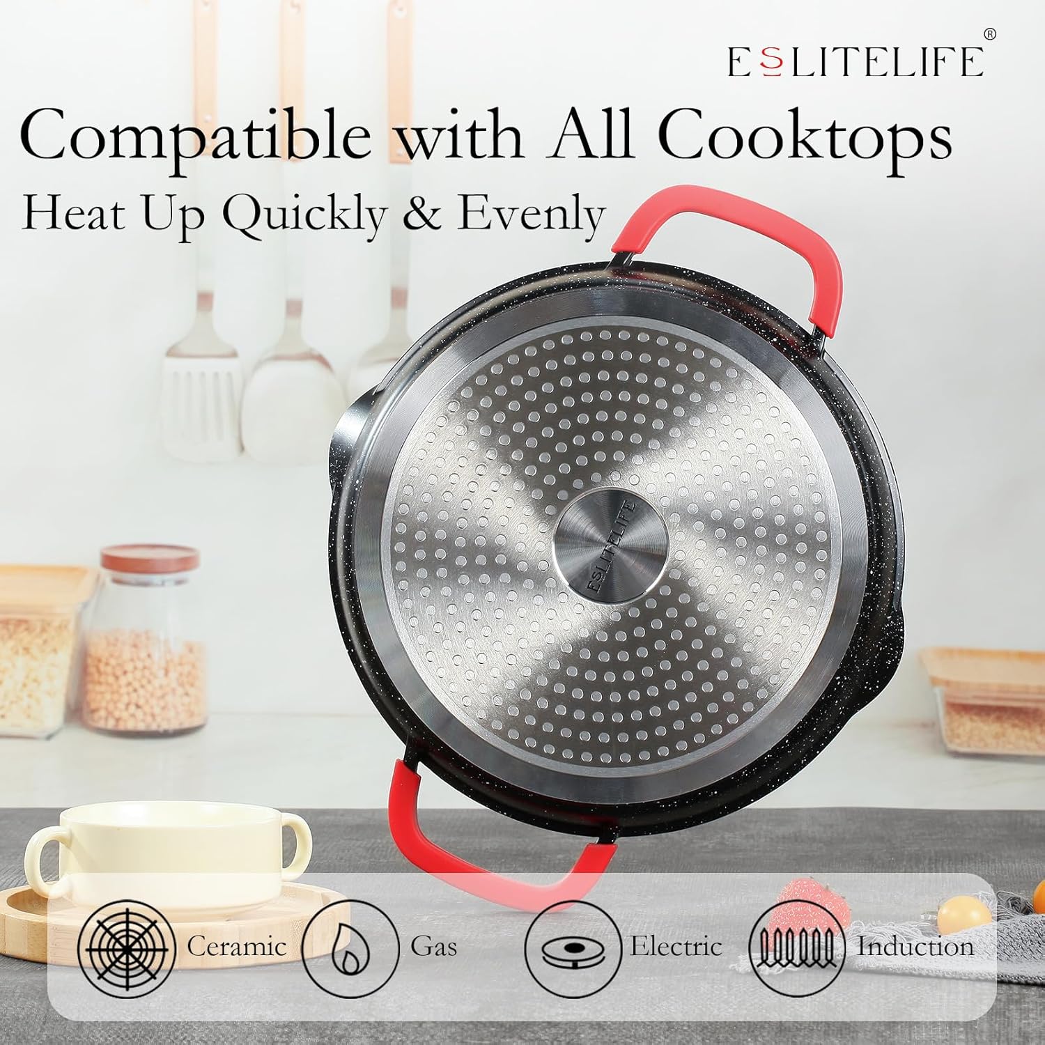 - Sturdy & Durable Body - The advanced die-cast aluminum technology, combined the advantage of cast-iron and traditional riveted cookware, conducts heats quickly & evenly, the thicken induction compatible bottom provides a stable heat distribution during cooking, rapidly heating up, saves time and energy.