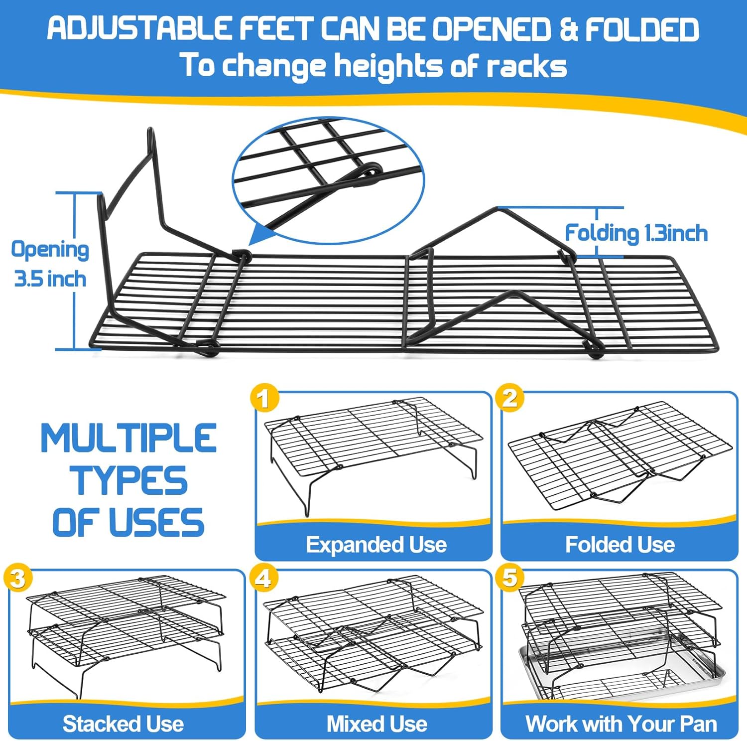 - 【CHANGE HEIGHT FLEXIBLY】The flexible feet can be swung over 90° to change height of racks, With 3.5-inch height when opened fully : Provide higher and larger space to accommodate large baked goods, Easy to stack stably on the another rack, With 1.3-inch height when folded fully : All racks could be collapsible and stacked one by one to save your storage space
