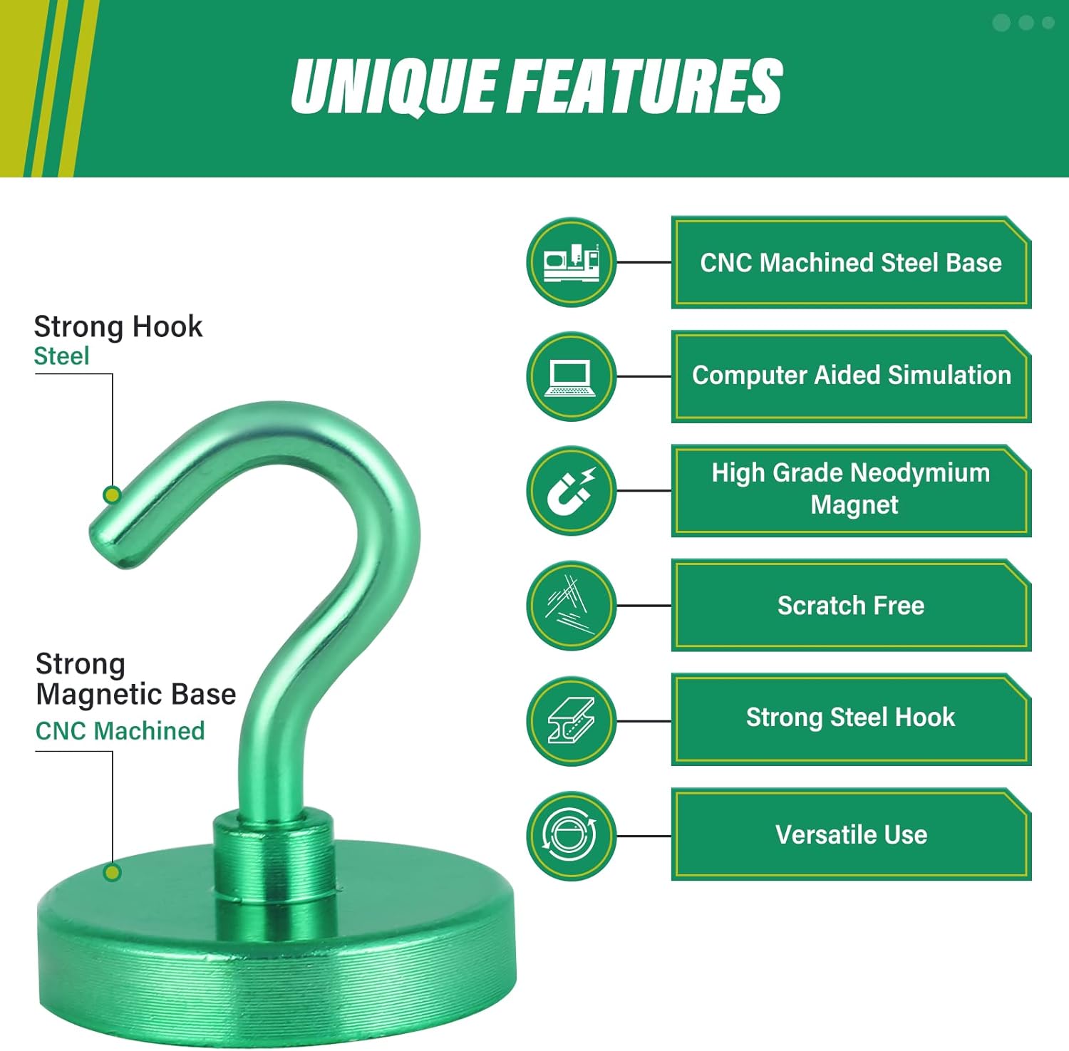 Neosmuk Magnetic Hooks Heavy Duty,Strong Magnet with Hook for Fridge, Super Neodymium Extra Strength Industrial Hooks for Hanging, Magnetic Hanger for Toolbox, Cruise, Grill(Green,10 Pack)