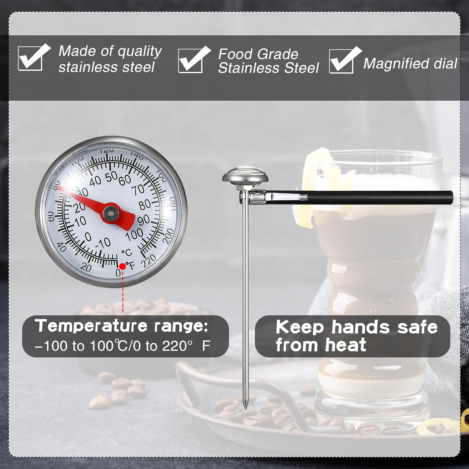 - Easy and Practical: with a fine material and a simple appearance, you can use our thermometer for cooking to measure the temperature of milk, coffee, drinks, red wine, tea, water and so on, easy and practical, a good helper in your kitchen