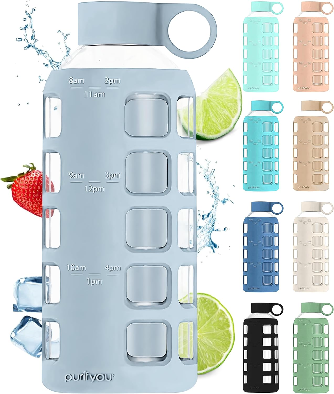 purifyou 40oz / 32oz / 22oz / 12oz Borosilicate Glass Water Bottle with Time & Volume Markers, Silicone Sleeve, Stainless Steel Lid – Reusable Glass Bottle for Water & Juice (22oz Ice Blue)