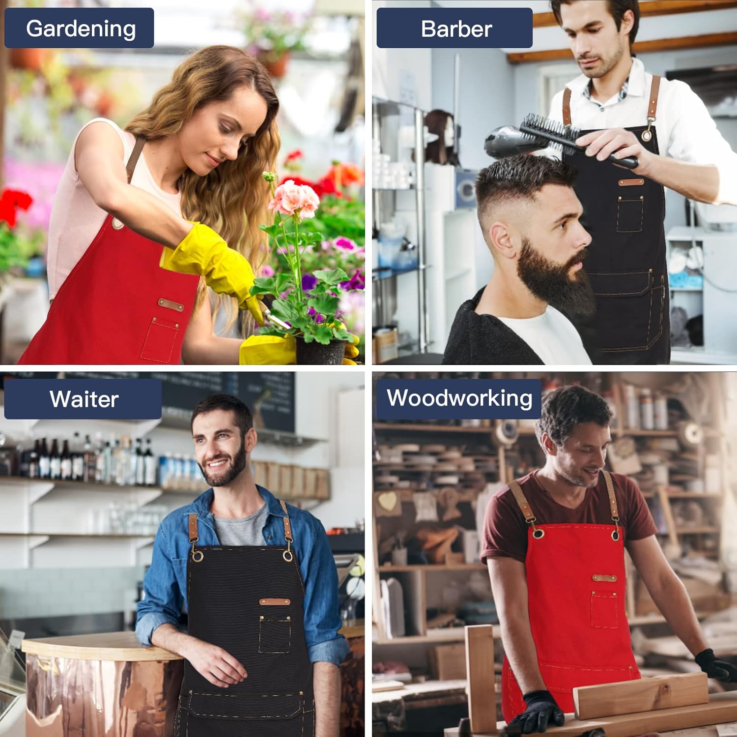 - FASHIONALBLE DESIGN: Designed with cross back straps, to prevent your neck pain. You can adjust the straps length to fit your body size. 4 multiple pockets offer you enough place to keep your tools within arm's reach and easy to pick up conveniently. Pockets corners are reinforced with metal rivets. Also, anti-rust brass buckle fasteners & metal rivets make our Serving Apron look stylish. Such an exquisite Cotton Canvas unisex Apron could be an amazing gift for your family or friends.