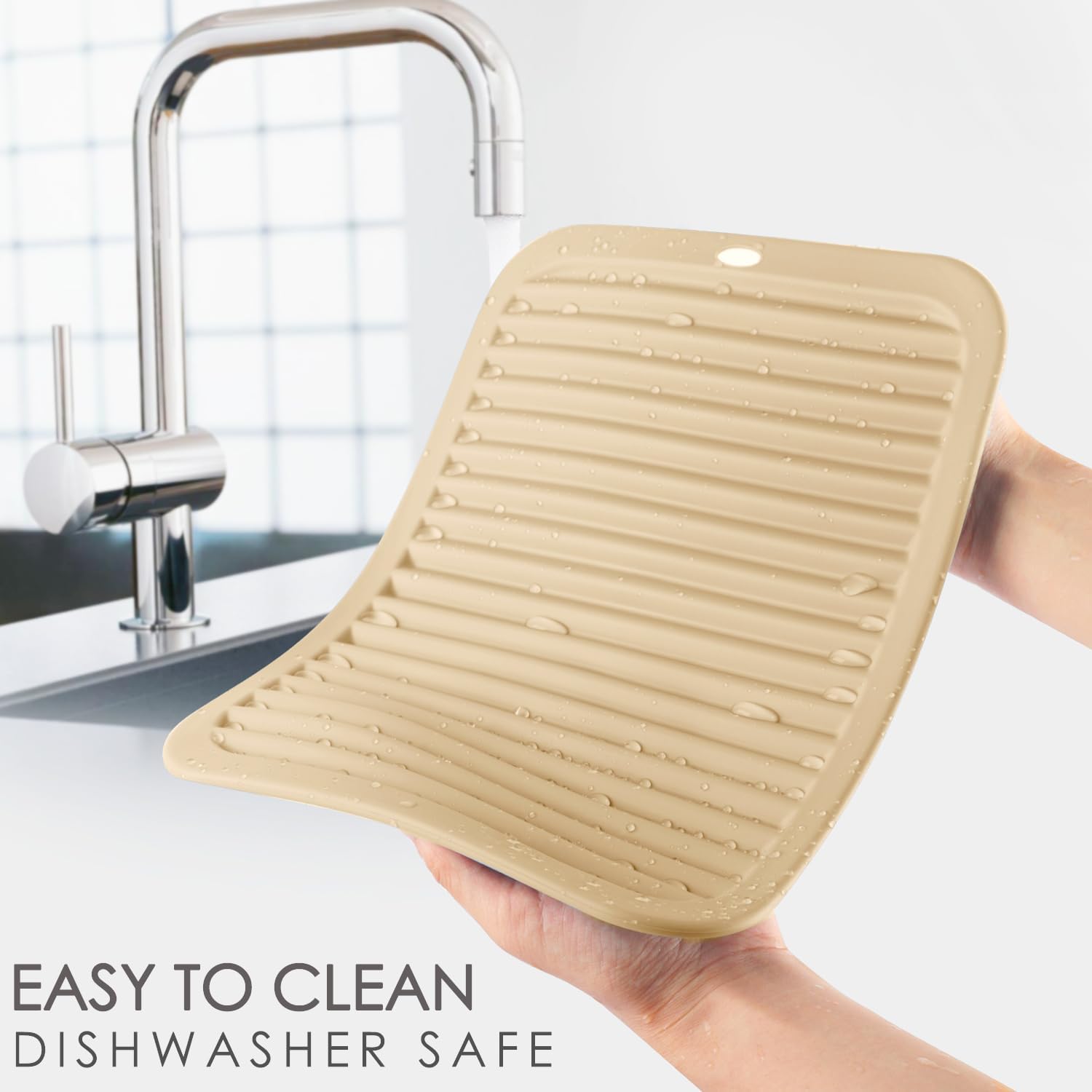 - 【VERSATILE KITCHEN TRIVETS】: It is perfect as a silicone hot pad or anything in the kitchen that needs a silicone pad. One beige trivets for hot dishes replaces at least four kitchen gadgets. We can use the beige silicone trivet as a potholder, small dish drying mat, silicone placemat, jar opener, coffee maker mat, garlic peeler, or teapot mat for other kitchen utensils.